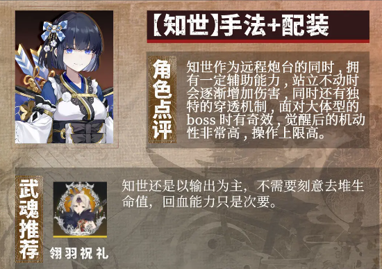 当知世处于静止状态时,其伤害会随时间逐步叠加,形成持续增伤效果。面对大型BOSS时,该角色还具备独特的穿透机制,能够显著提升整体输出效率。从定位上看,知世的核心职责是打出高额伤害,因此在武魂选择上应优先考虑输出属性,无需侧重生命值堆叠。虽然具备一定的回血能力,但这并非培养重点。推荐首选武魂为翎羽祝礼,该武魂可有效增强伤害输出,最大化战斗表现。