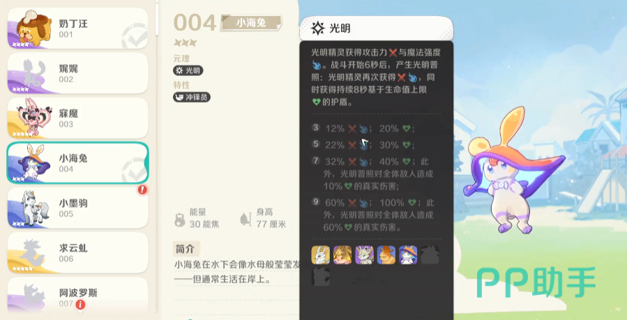 该精灵身高为77cm,初始能量为30能焦,这意味着在游戏前期能够较为轻松地完成技能释放,无需过多资源支撑即可投入实战。从元理属性来看,小海兔属于光明系角色,担任先锋单位时不仅能吸引敌方攻击,还能利用自身元理机制提升队伍整体生存能力。其所提供的团队增益,如加速与护盾效果,对多数阵容而言都具备实际战略意义。