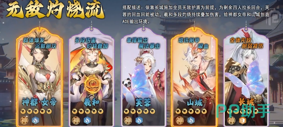 首推「持续灼烧流」——以高频率状态施加与长时间伤害积累为核心逻辑。该体系由羲和、山城、芙蓉、神都女帝及长城五人构成。其中,羲和承担核心灼烧扩散职能,其大范围技能可快速为多个目标叠加多层燃烧状态;神都女帝则强化单体灼烧浓度,二者协同显著提升总伤转化效率。山城与长城提供双层生存保障:前者增强队伍抗压韧性,后者生成稳定护盾,大幅延长灼烧生效窗口。芙蓉作为唯一治疗位,不仅通过被动持续恢复全队生命值,还同步补充技能能量,确保灼烧链不断档。该流派不依赖瞬时爆发,而胜在伤害随时间指数级增长,在对抗高防御、高血量Boss时尤为高效。