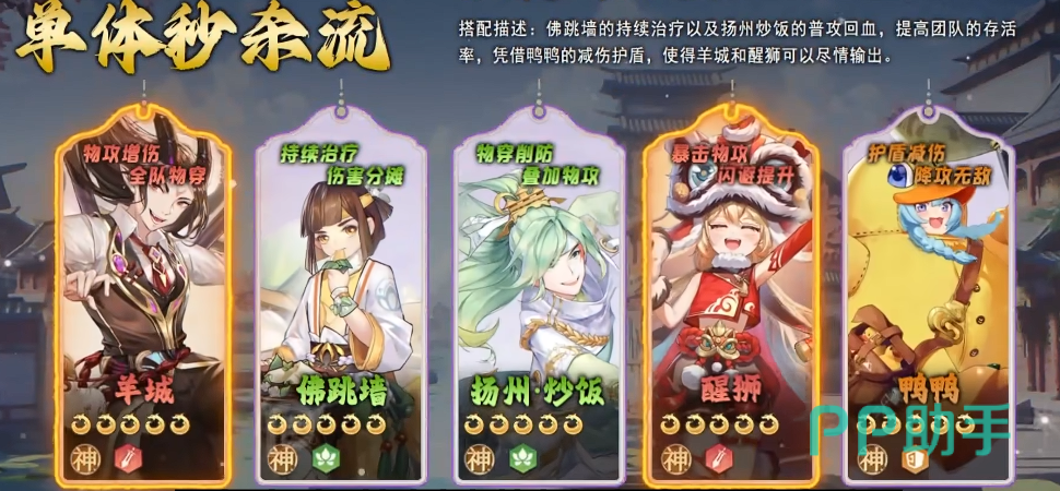 第二套推荐为「单点爆发速杀阵」,主打高精度集火与短时极限输出。阵容配置为扬州炒饭、鸭鸭、佛跳墙、养成、醒狮。佛跳墙是本阵绝对核心,拥有极强的单体锁定与伤害聚焦能力;扬州炒饭则在普攻阶段同步触发治疗,形成“打即回”的攻防闭环;鸭鸭提供团队减伤与护盾增益,为输出角色创造安全环境。养成与醒狮作为双主C,共享爆发型技能机制,可在3秒内倾泻大量伤害,配合佛跳墙的集火引导,实现对精英怪或Boss的精准秒杀。整套阵容容错率低但上限极高,适合挑战限时副本或高难度单体关卡。