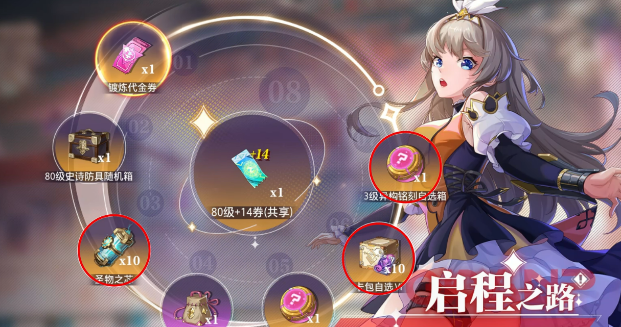 80级后福利持续加码,包含史诗合铸装备自选权、圣物之芯、卡包自选、三级异构铭刻自选箱、额外加14强化券及团本专属增益buff。上述资源组合可有效支撑玩家顺利通过高难度团队副本准入门槛。此外,连续登录满8天还可额外领取登录礼盒,建议每日完成签到任务以确保权益完整获取。