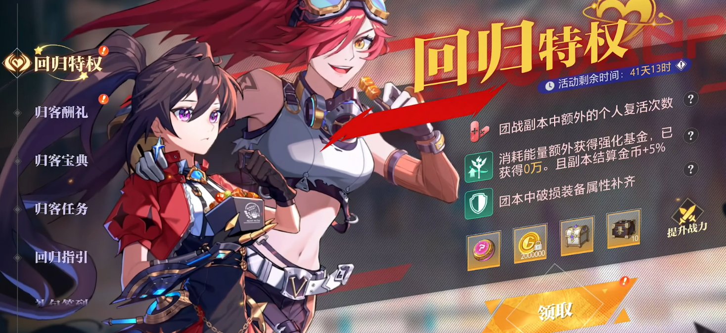 回归玩家专属活动“回归阿特兰”同步开启。系统将自动修复破损装备属性,且体力消耗可额外兑换强化基金,显著降低追赶成本。完成归客宝典解锁后,可批量获取稀有养成材料,并享有回归专属团本辅助机制,帮助角色状态高效回血。回归登录礼亦已就位,具体细则请于游戏内活动界面查阅。