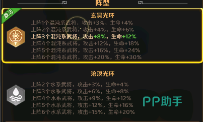 全武将按火、混沌、水、风四系划分,存在明确克制关系:被克制方受伤害提升25%,命中率提高20%。合理利用属性克制可大幅优化战斗效率。同时,元素光环系统要求同系武将至少上阵2名方可激活,每增加1名同系单位,光环效果叠加增强。因此,围绕单一属性构建阵容,是提升战力转化率的关键策略。