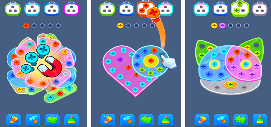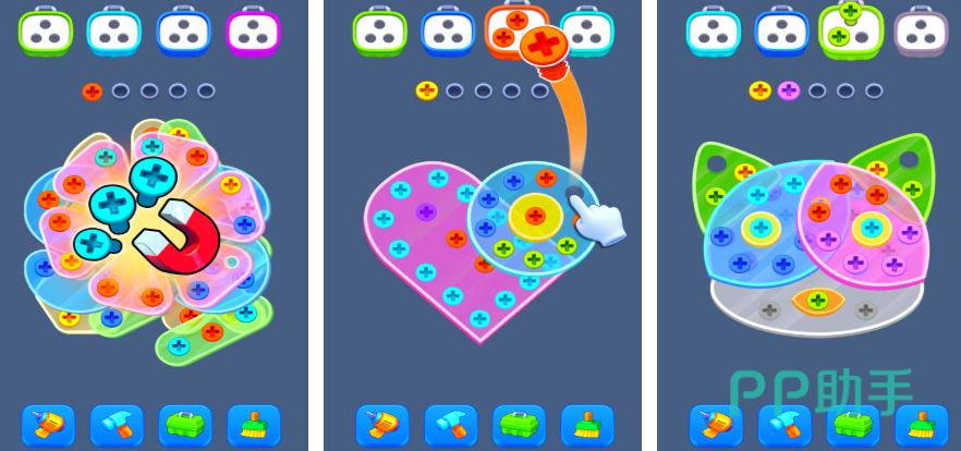 趣味十足的消除类趣味手游,玩家不再通过点击来消除方块,而是需要将不同颜色的螺丝扭在相同的孔洞中,将所有螺母盘填充完毕,所有螺丝都消除完才算胜利。关卡内有独特的道具帮助玩家切换螺母或者刷新。每关中都有不同的螺母盘挑战,还可挑战高难度复杂关卡,看看自己的极限在哪里,休闲趣味十足。