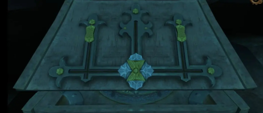 打开后,将白色的挡板拖开,有一个十字架露出,会有一个星星形状的杆子,将杆子放进圆桌的中间,进行旋转会打开机关,根据提示摆好形状,第二道则是扭动机关,解开后得到零件。