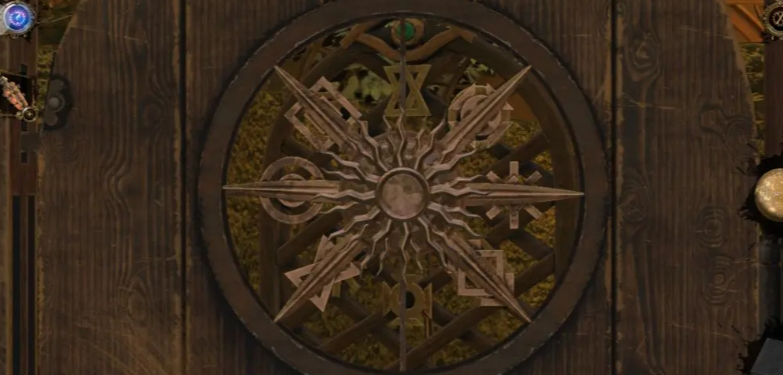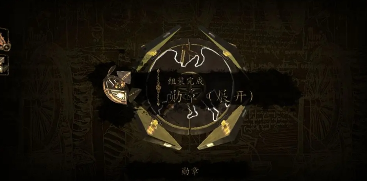 得到勋章之后,找到右侧机关,放入。让线连接每一个点,连接后下方会弹出一个轮盘,按照书本图像揭开机关,回到初始地方,轮盘放在铁门当中,注意角度要对准空心圆环。