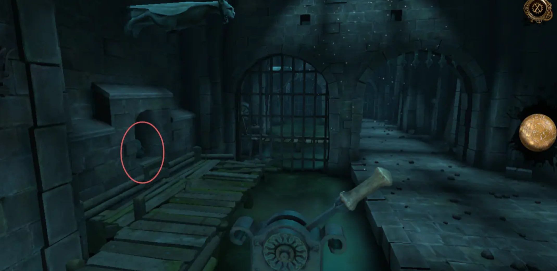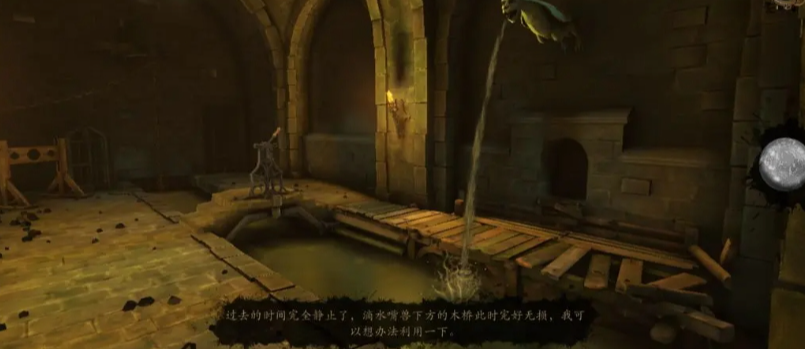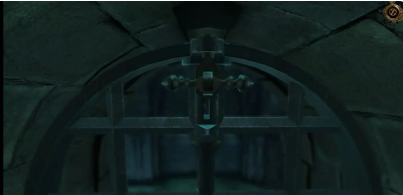 随后拉动摇杆让锁链下沉,将锁链套入刑具中,再次拉动,刑具将会把链子搅坏,初始点会有一个勺子,我们拾取后,将勺子放入代替零件,再次拉动门开启进入地下室。进入地下室后我们会发现一个铁栅栏,拉动铁栅栏就会开启,铁门打手在上方。