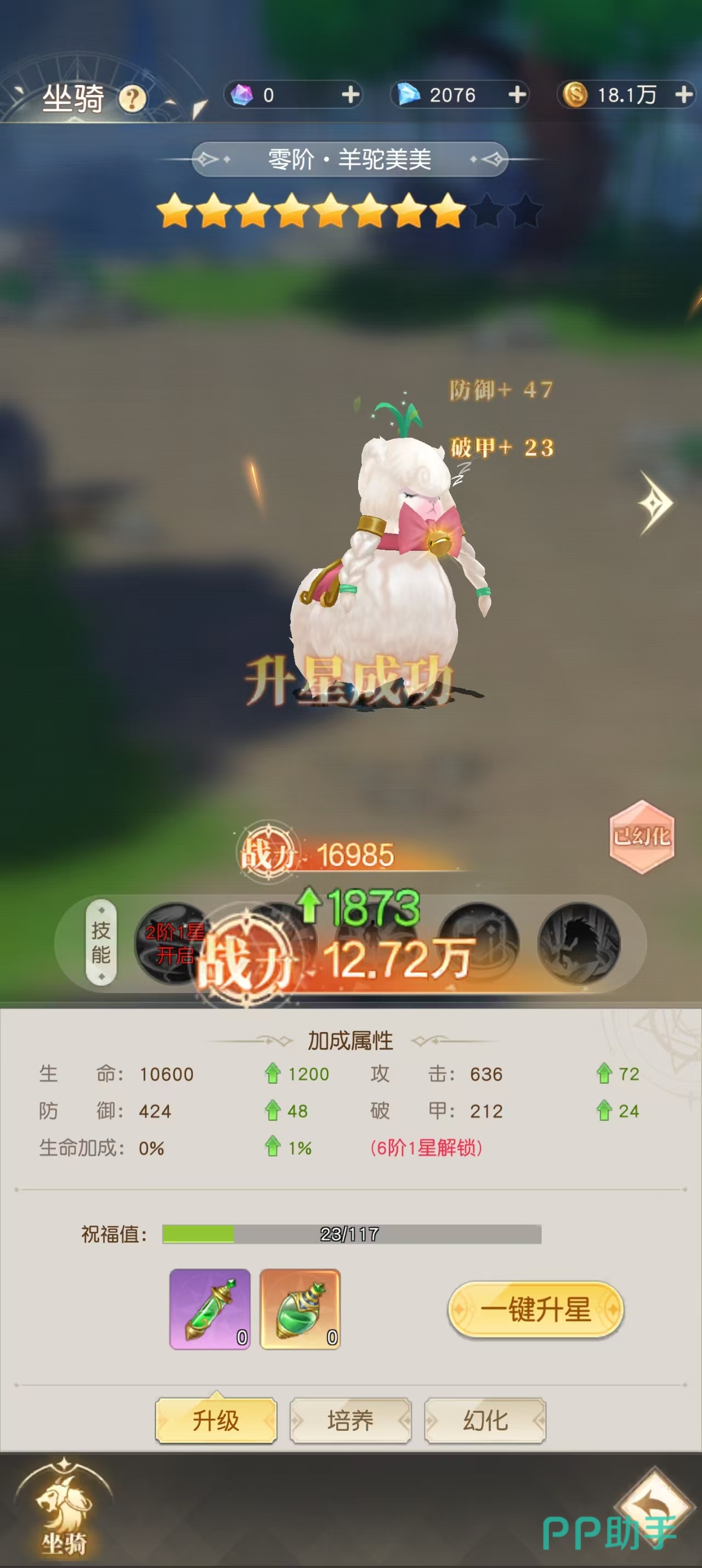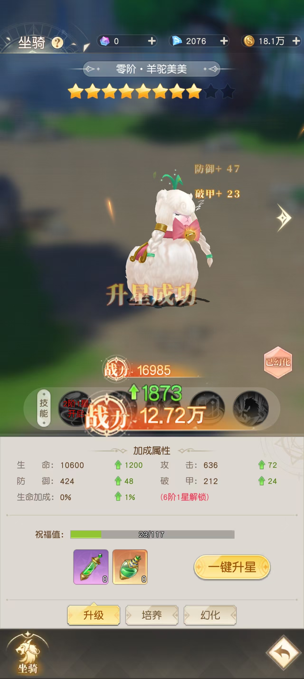 幻化功能是《星神纪元》坐骑体系最具辨识度的设计之一。该系统允许玩家在不改变当前坐骑任何数值(含星级、等级、培养词条)的前提下,自由切换已解锁的坐骑外观。无论是复刻初入游戏时的羊驼美美,还是展示稀有主题限定款坐骑,幻化均兼顾实用性与个性化表达,满足收藏欲与审美需求双重目标。