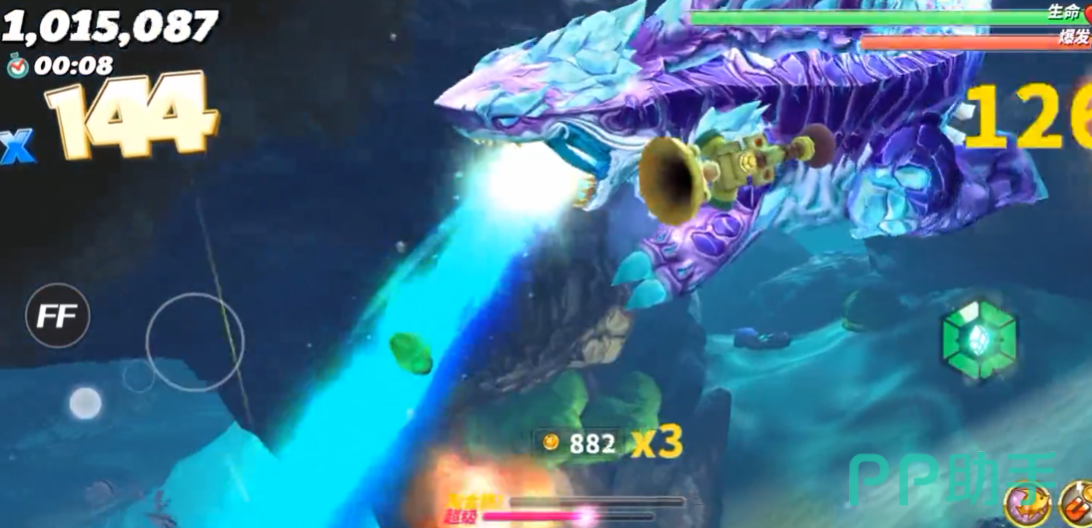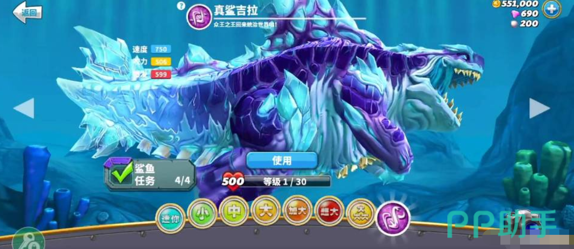 真鲨吉拉的基本攻击包括强力咬击和尾击,这些可以通过简单的触控操作就能释放了,而它的特殊技能:能量波和使用激光束攻击,都需要在进食一段时间之后积累能量再进行释放,能量波可以清除路径上的障碍物短时间内增加属性,而激光束则可以对范围内的敌人造成大量伤害。且分数会相应的提高。