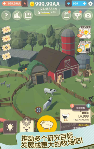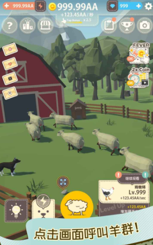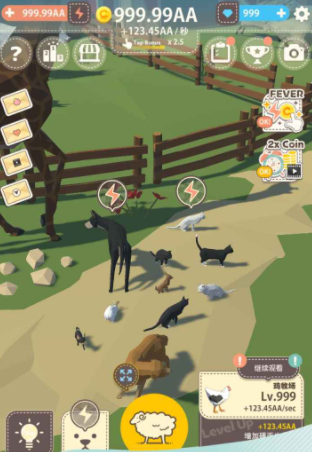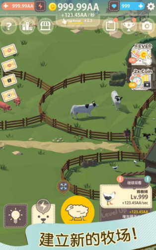 游戏里没有太复杂的玩法,因为这些动物能自动产出金币,所以玩家的终极目标也不是出售这些动物,可以一起陪伴这些动物,感受悠闲的农场时光,但是随着后期动物的增多,他们的金币产出量也会越来越多,要想不损失这些金币,玩家就需要有比较快的手速,这样才能把金币全部都收集起来。