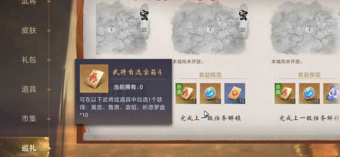 第三关奖励进一步升级:解锁【自选橙色武将礼包】,内含黄忠、袁绍、鲁肃三名橙将供玩家自主择一领取。其中黄忠为典型高爆发物理输出角色,适用于快攻压制类战术;袁绍侧重群体控制与范围压制;鲁肃则强化队伍生存与资源循环能力。此外,本关通关还将额外赠送10个祈愿罗盘,实现资源叠加效应。后续城池挑战持续释放高价值回馈,包括多档自选武将礼包及高级卡包——后者拥有更高概率产出红色及以上稀有度武将,是中期战力跃升的重要保障。