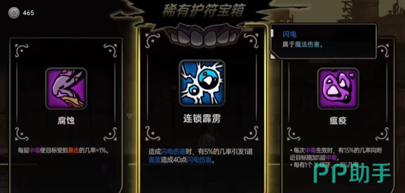 稀有护符宝箱房间则以概率形式开启高品质护符池。此类房间不提供直接选择权,但宝箱品质越高,开出高价值护符的概率越大。例如“连锁霹雳”护符,可在普攻命中时触发范围闪电链,对多目标造成额外伤害,实战中具备极强的AOE压制能力,是中期过渡阶段的重要输出补充。