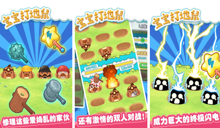 宝宝打地鼠是款老少皆宜的高刺激性地鼠互动游戏,小朋友可通过点击屏幕跟可爱地鼠们斗智斗勇,打地鼠获取积分的规则理念别具一格,更有闪电、火焰等技能能对地鼠进行打击,多人对战模式的加持让这款地鼠游戏更刺激,绚丽特效加舒适点击快感吸引了不少小朋友,反应能力比较强的小朋友建议玩玩这款作品。
