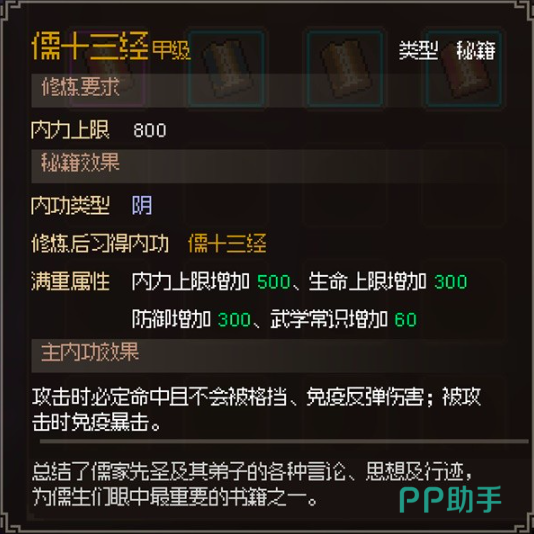 儒十三经是游戏当中最强的甲级阴性功法,不过要想学习该功法的话,对于修炼是存在一定要求的,玩家需要将自己的内力上限提升至800级以上,并且要完成前期相对应的任务内容,而且该秘籍效果极佳,玩家在满级后内力上限可再提升500,生命上限线可再提升300。防御值则可增加300,武学常识则可增加600。在后期面对一些强大敌人时可发挥更强的格挡功能,而且与会新一机搭配使用还可以增强暴击伤害率。不过需要提醒玩家的是该秘籍会被万民长暴击,并且和玉玺会互相抵消,所以玩家在使用的时候,一旦处于满血暴击状态的话,可直接使用十三经,这样就可以直接打出6万多的伤害值,在后期是很多玩家们的必练功法,小伙伴们可以在游戏当中尽早获得,而配合在该章节获得的罢黜百家这个甲级武林秘籍,能够帮助玩家实现攻防同用,打出非常不错的效果。