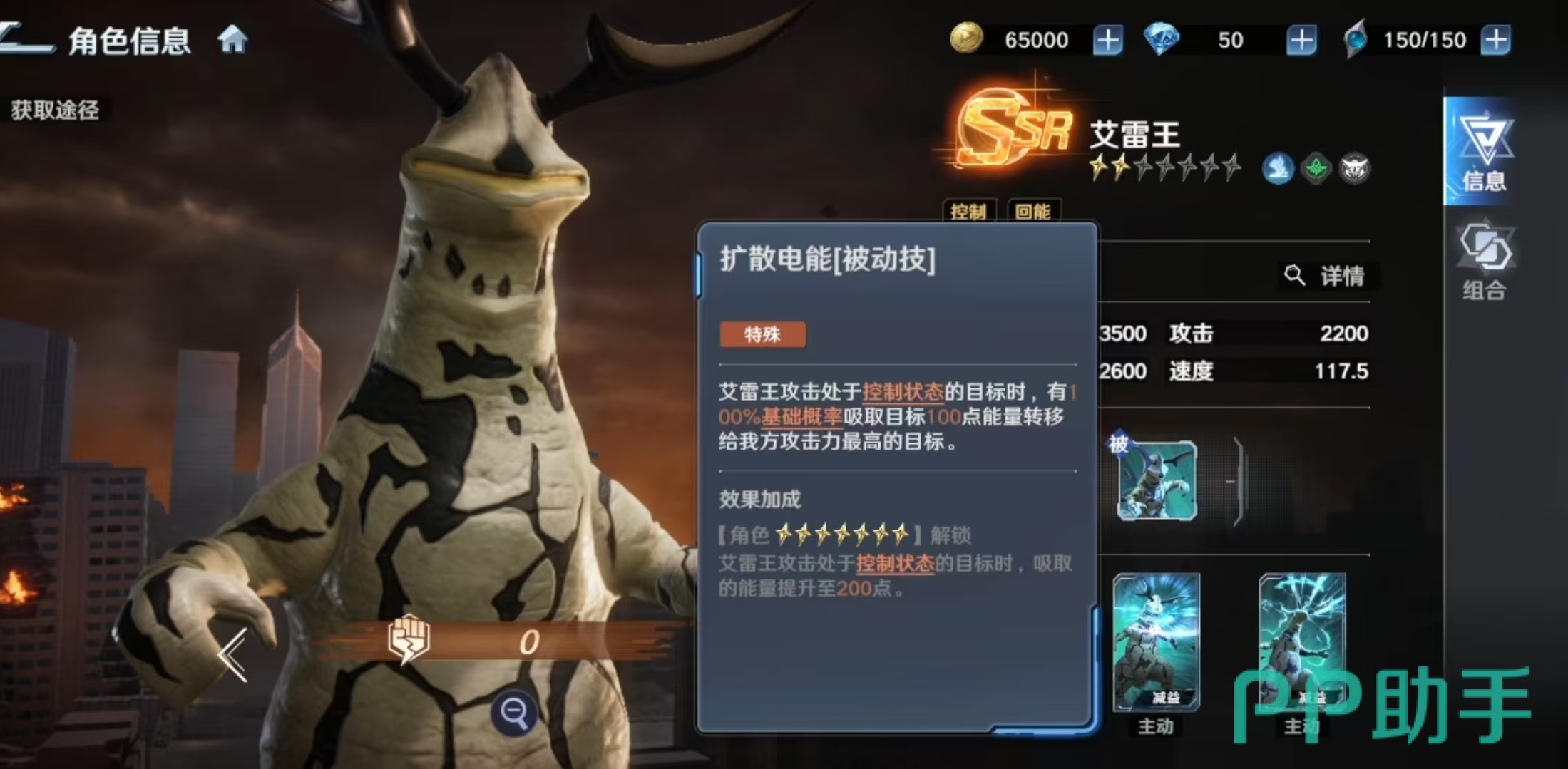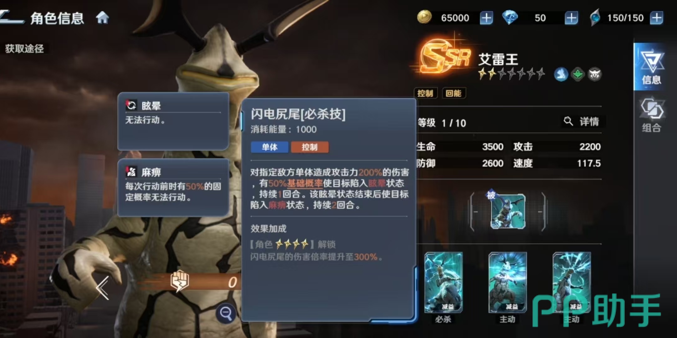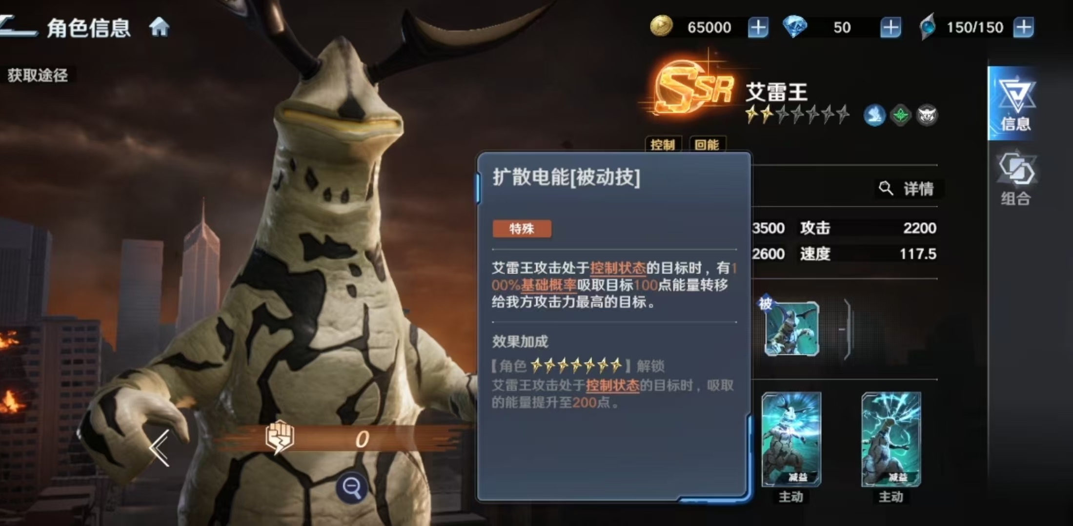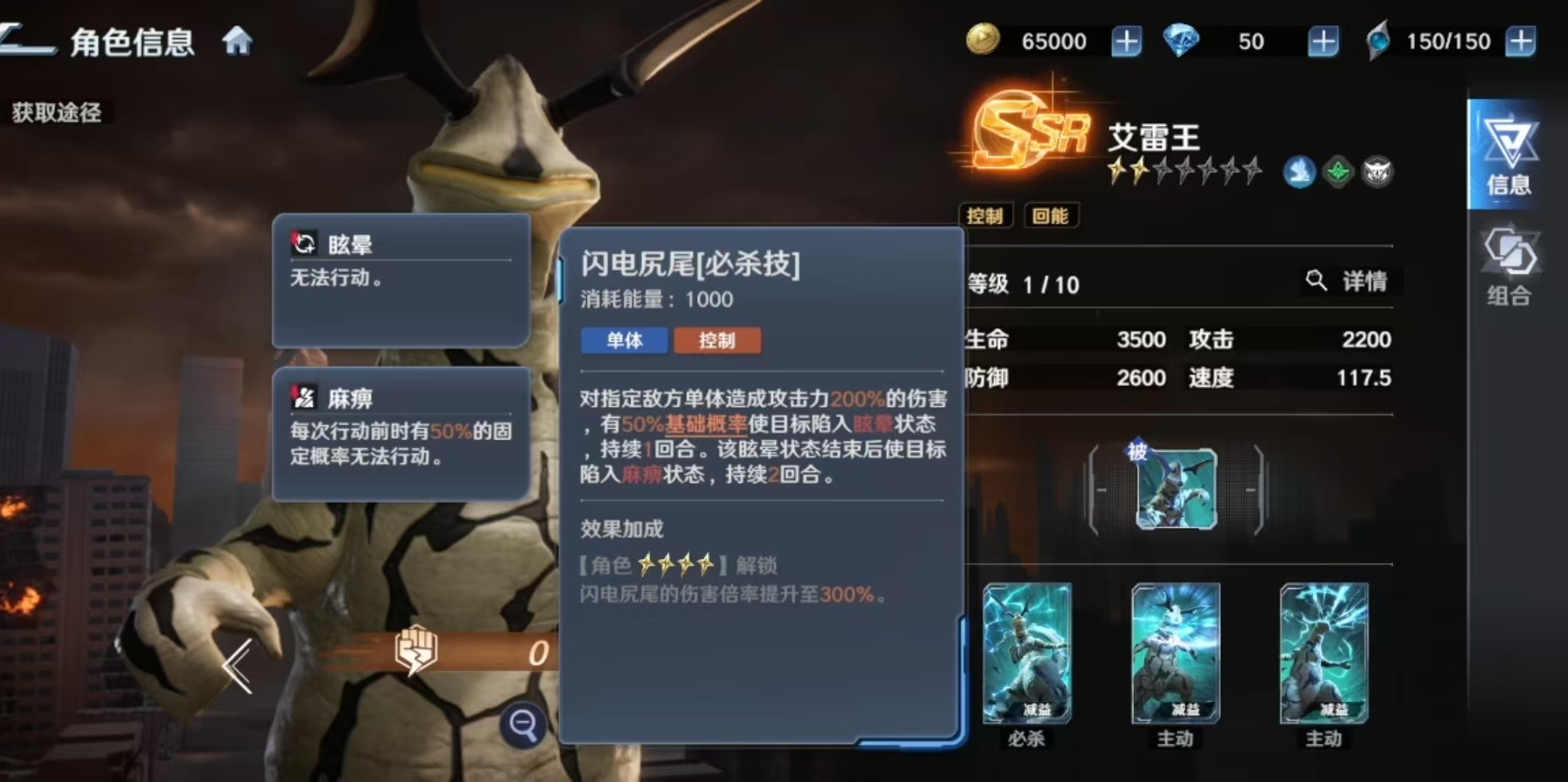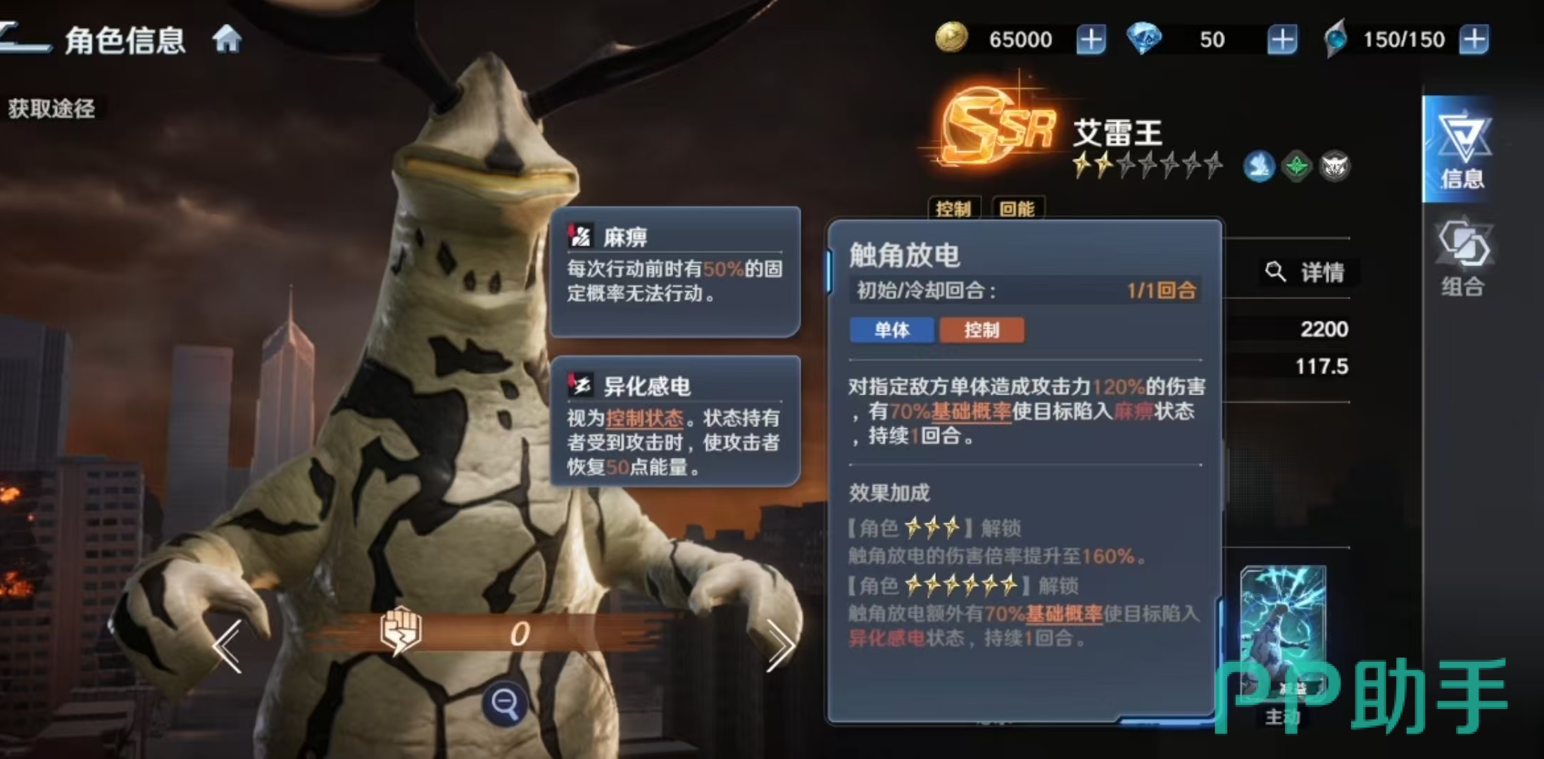其必杀技具备分段控制链:首次命中造成伤害并附带一回合眩晕;眩晕结束后自动触发两回合麻痹效果。两次控制均能稳定激活被动能量抽取,形成持续压制闭环。两个主动技能同样聚焦于控场延伸——“放电光线”对单体实施三段打击,每次均有概率施加麻痹;另一主动技则在单体伤害后附加麻痹,并在升星后额外赋予“线路异化感电”状态。该状态不仅计入控制判定,还可反制敌方行动:当艾雷王受到攻击时,攻击者自身将恢复能量,进一步放大我方续航与节奏优势。