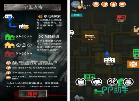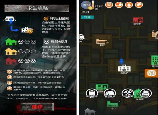 这是以一人一犬为角色的废土游戏,进入废土之城以后,你需要掌握求生攻略,比如想要获得装备的情况下,需要自己在丰富的地图上,点击建筑图标的方式,完成移动以及探索,这样有利于获得更多的物资。通过游戏中各种危险标识的情况,了解房子的危险程度,保证游戏中的角色,在各方面的生理需求上是正常的。所有的操作还会消耗精神,可通过休息或者是提升物资,帮助自己拥有一定的精神。