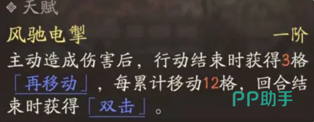 吕玲绮的核心天赋名为“风驰电掣”,该天赋在1级时便展现出强大的战场适应能力——她在发动主动攻击并造成伤害后,可在行动结束时额外获得3格再移动机会。这一机制极大地提升了她的战术灵活性,使其能够快速调整站位或切入敌方后排。更值得注意的是,每当她在单回合内累计移动达到12格,且该回合行动结束时未被控制类效果限制,即可触发“双击”增益状态。该状态虽可被敌方驱散,但一旦成功激活,便能为下一次普攻附加20%的物理攻击力提升,并赋予追击能力。
