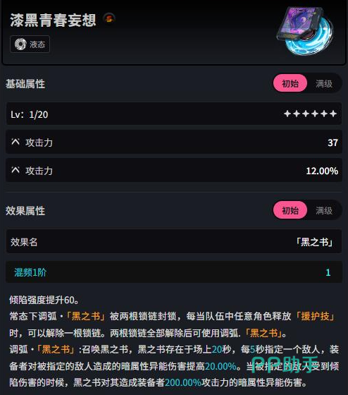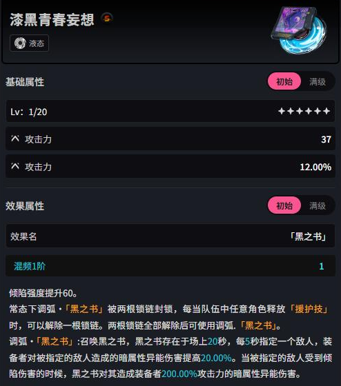 “漆黑青春的妄想”走纯攻击向强化路线:基础攻击力同样为37点(1级),满级时额外获得12%攻击力加成。该武器围绕“黑之书”机制设计——常态下黑之书处于封锁状态,但当队伍中任意角色成功释放援护技能时,即可解除1次封锁;激活后持续20秒,期间每5秒自动锁定一名敌方单位,并显著提升装备者暗属性伤害倍率,适合暗系主C或需要高频触发援护联动的战术体系。