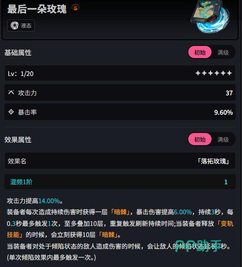 “最后一朵玫瑰”以均衡成长性见长:初始等级1时提供37点攻击力与9.6%暴击率;满级后属性持续强化,特别适配依赖暴击频率与暴击伤害协同释放的持续输出型角色。其核心机制名为“落拓玫瑰”,可对目标施加多层持续伤害效果,每叠加1层即提升6%暴击伤害,最高叠加至10层;该效果具备3秒刷新窗口,确保DOT(持续伤害)链稳定运转,是构建高频暴击循环的核心支点。