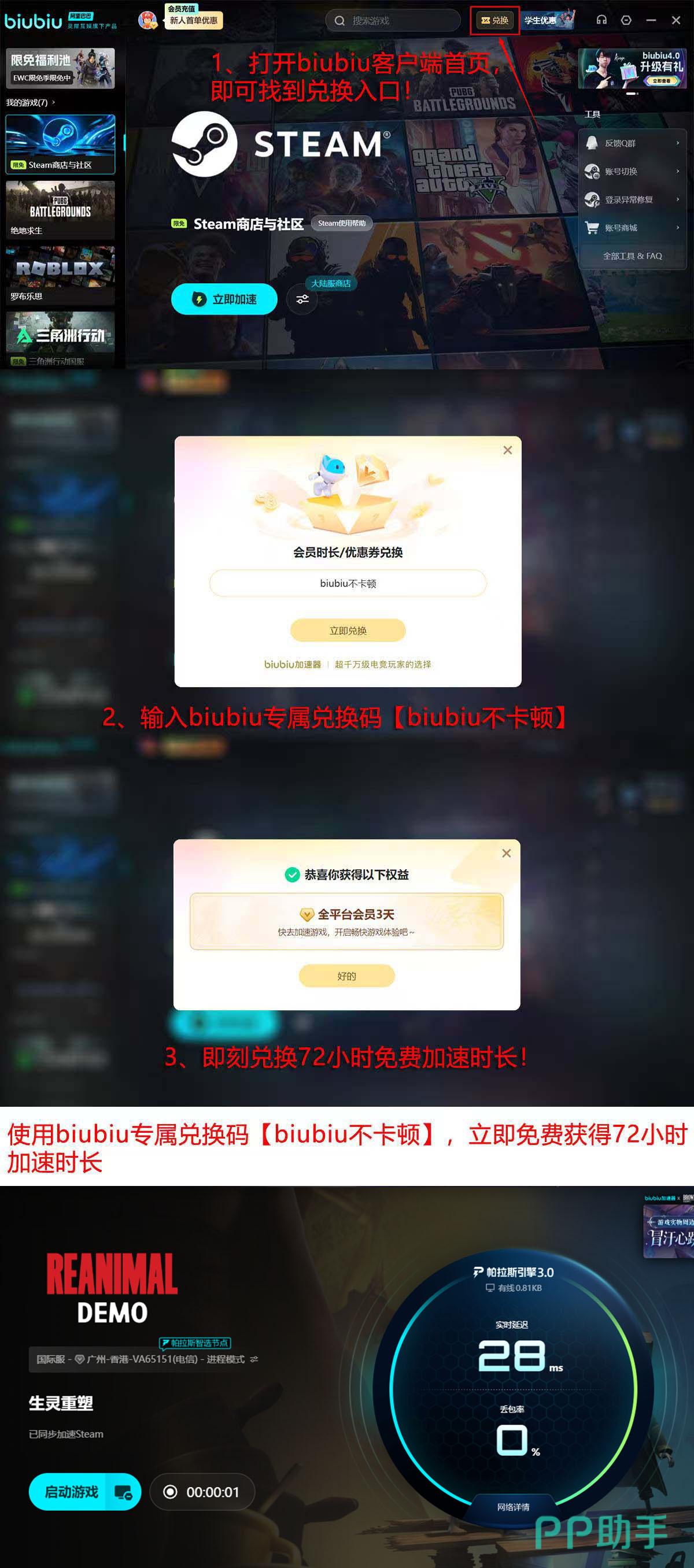 目前biubiu加速器开放限时福利:新用户完成注册后,系统自动发放24小时免费加速时长;另可通过首页兑换功能,输入口令【biubiu不卡顿】额外领取72小时,总计可享96小时无限制加速服务。
