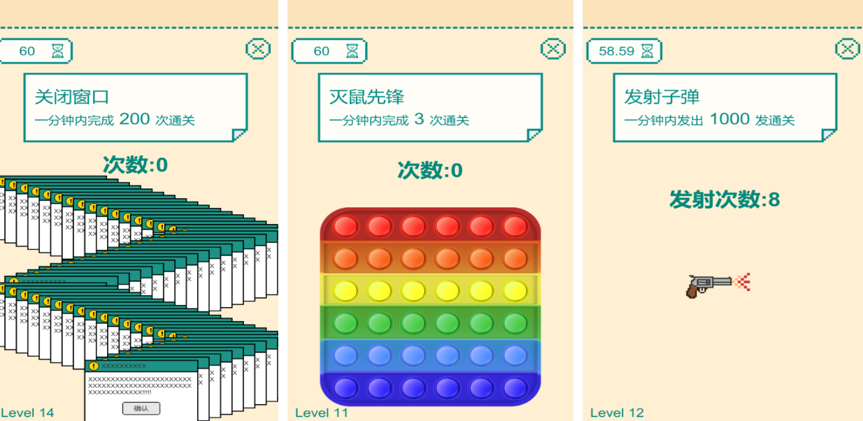 《一分钟手速挑战》主要考验的就是大家的手速,玩的时候需要在1分钟之内完成各种挑战任务。目前共有十几个好玩的小游戏,包括灭鼠先锋、发射子弹和关闭窗口的,小游戏虽然较为简洁,但十分考验反应能力。游戏画面清新简洁,玩的时候非常考验手速以及反应能力。新手玩家玩时应注意界面上的各种提示信息,了解到关卡的目标以后才可以更好地应对挑战。