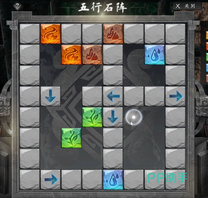 进入洞穴后,需要完成一个机关解谜才能继续深入。这个机关属于典型的连线型谜题,也是游戏中后期会多次出现的类型之一。解谜的核心是一个五色棋盘,玩家需操作棋子进行移动,使相同颜色的棋子彼此连接成片。