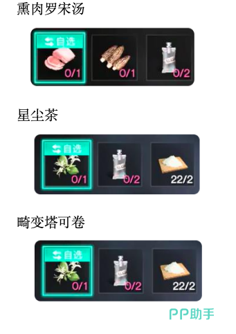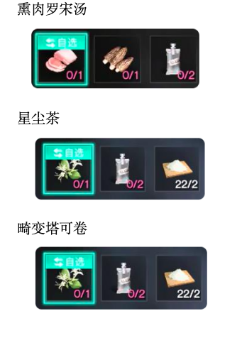 第三款畸变塔可卷,做这款实物的材料也非常简单,肉类一份,变异小麦两份,鱼子酱一份。使用后采集木材、普通矿石资源收益可提高80%。