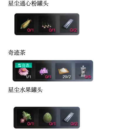 第二款星辰茶。在食用该食物后,玩家们的食物、饮水充足状态可提升至两个小时。要想制作这种茶,需要一份变异植物,两份水和两份糖。