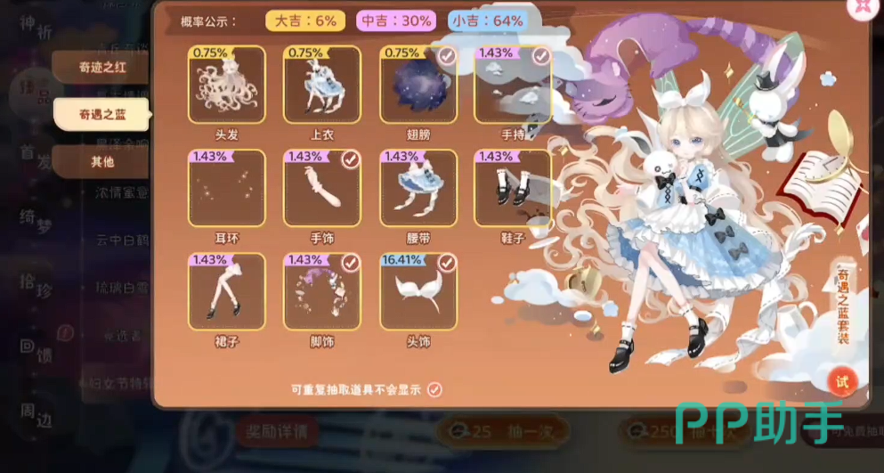 卡池内物品按品质划分为三级:大吉(高级时装)、中吉(中阶时装)、小吉(基础时装)。其中大吉部件掉落概率恒定为6%,集中于上衣与发型两大核心形象模块;中吉概率为30%;剩余64%为小吉品质。该数值分布为游戏固定设定,不可更改。