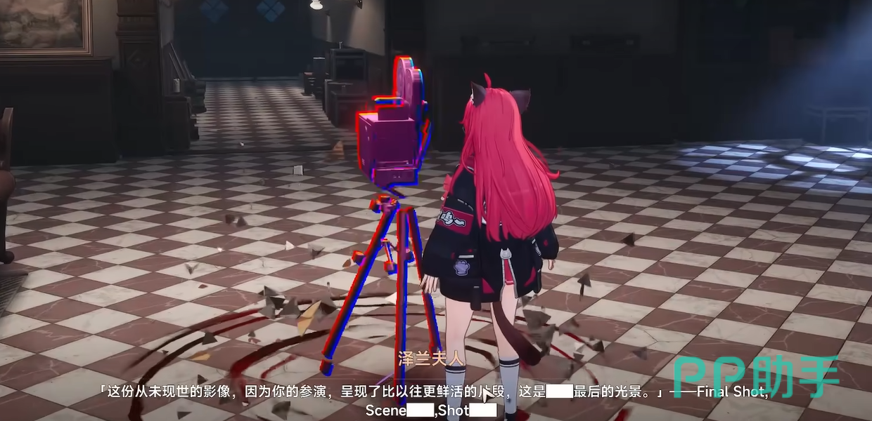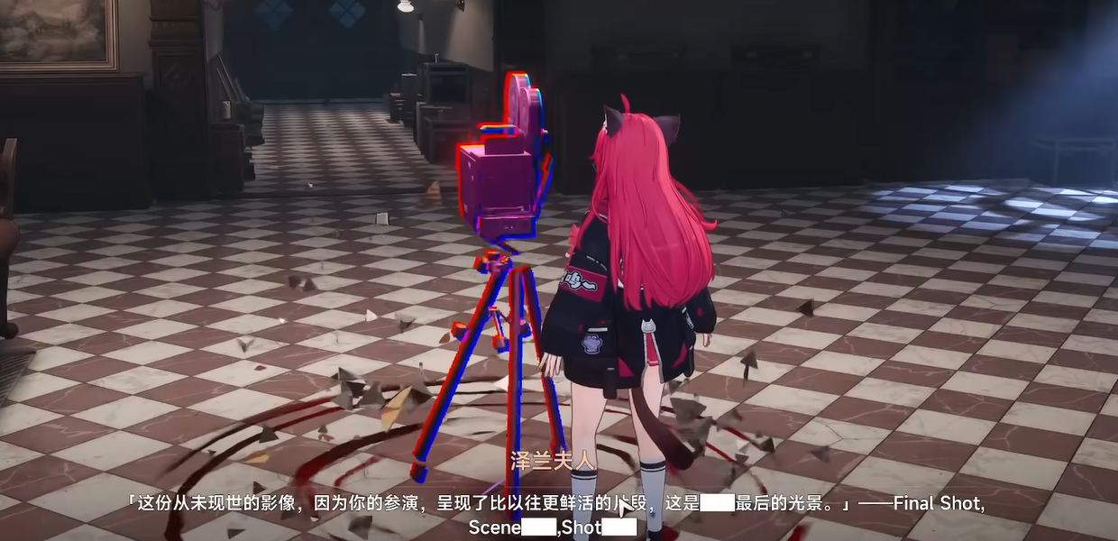 副本入口处首台放映机为启动装置,交互后自动开启主通道。沿长廊前行抵达中央大厅,可见二楼平台悬于半空,原生楼梯已断裂,无法直接攀越。