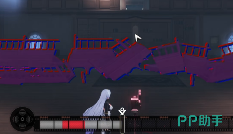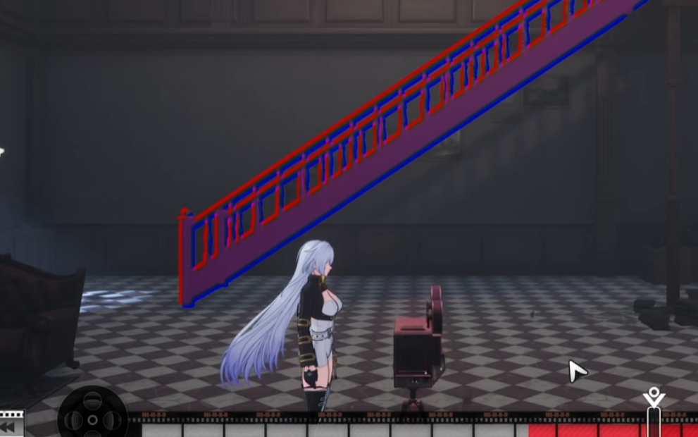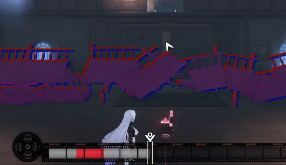 后续路径再遇第三台放映机,仍需启用“播放”功能调出阶梯影像。但本次修复存在限制:仅部分结构可恢复。观察进度条标识,将滑块精准移入标红区间,即可生成一条具备通行功能的非完整阶梯,支撑角色向上移动。