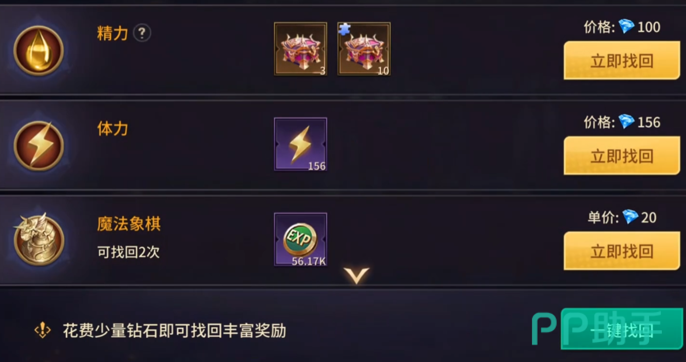 该玩法单次挑战仅需消耗20点体力,成本极低。其核心优势在于“找回”机制:玩家完成对局后可立即使用找回功能,一次性领取全部通关经验奖励。系统每日开放两次找回机会,总计仅需40点体力,即可稳定获取双份经验收益。这一设计兼顾轻度玩家的碎片时间操作与重度玩家的快速养成需求,让角色等级提升节奏始终可控、高效。