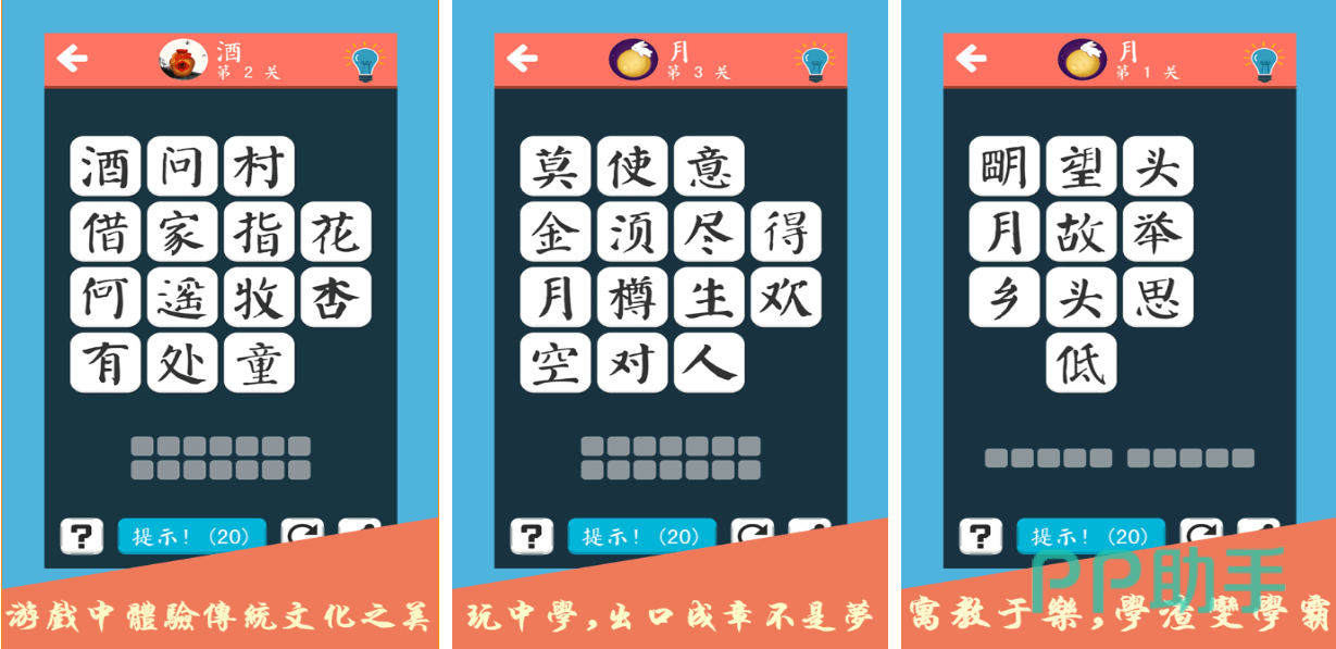 这是款融合浓郁诗词文化的解谜类型闯关游戏,传统文化的独特美感也会在这款佳作中重现,各类寓教于乐的诗词解谜玩法耐玩性不错,简单的美术表现搭配烧脑的性质可玩性极高,点触汉字图片组合诗词的游戏理念也是亮点,个性化的解谜机制和提示功能增添了趣味性,诗词歌赋爱好者可在诗词大会飞花令体验下传统文化。