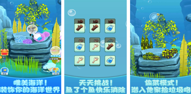 一个主打养鱼的趣味性小游戏,玩家就可以打造一个专属的海底世界,除了可以满足收集的欲望之外,还有很多挑战的玩法。一旦在挑战完毕之后,就可以得到一些比较少见的道具。大家可以选择搭建水族馆,然后和其他的一些玩家去完成排名的争夺,体现整个游戏的竞争性。