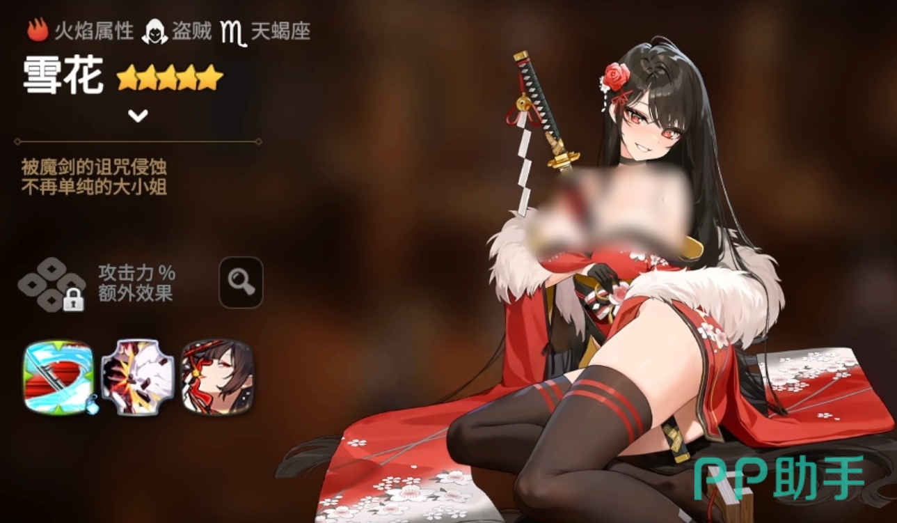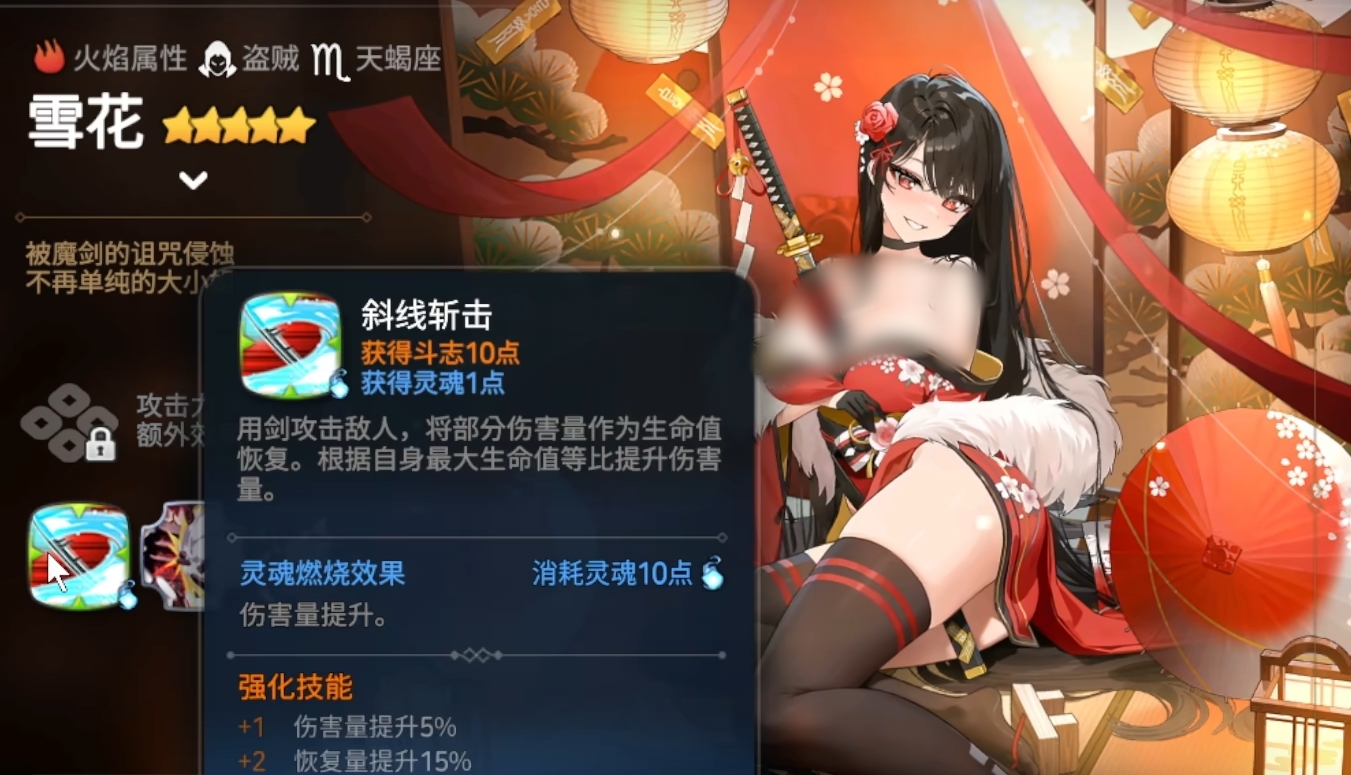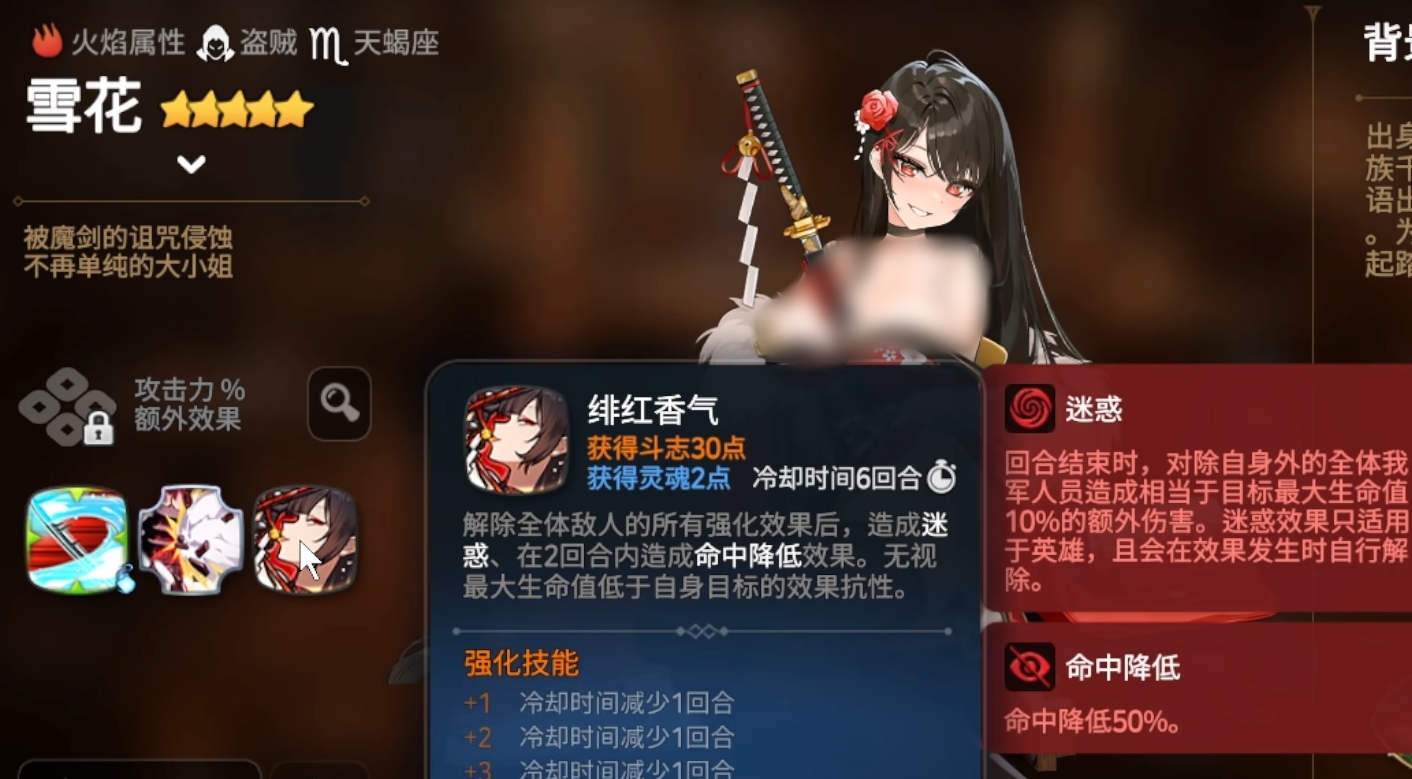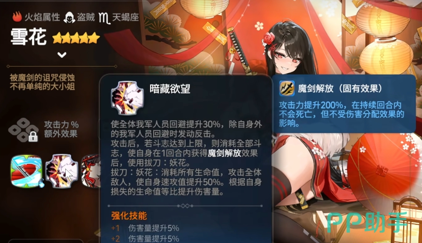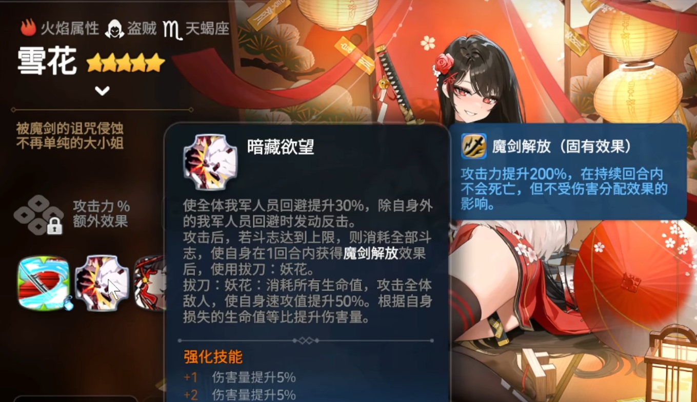 雪花的核心输出来源是她的二技能“暗藏欲望”,这是一个被动技能,能够为全队友军提供30%的回避率加成。每当除雪花外的任意队友成功规避一次攻击后,雪花便会立即发动一次反击,并在此过程中积累斗志值。当斗志积满时,她可释放魔剑解放,牺牲自身全部生命值,对敌方全体造成巨额伤害,且伤害量与所消耗的生命值成正比,这一效果使其成为游戏中少有的高倍率自爆型输出单位,因此也被玩家称为新一代“自爆卡车”。即便不考虑终结技,仅凭团队闪避触发的连续反击机制,已足以打乱对手节奏,形成压制。