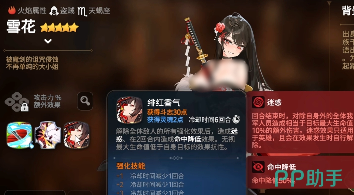 她的三技能“绯红香气”则进一步强化了队伍的闪避联动效率,该技能可清除敌方全体增益状态,并附加命中降低的“迷惑”减益,从而提升我方角色成功闪避的概率,间接激活雪花的反击链条。此技能与二技能形成良好配合,增强了整体战术连贯性。而一技能则是以自身最大生命值为系数的伤害技能,不仅能打出可观输出,还能基于造成的伤害回复自身血量,显著提升其战场生存能力,减轻队伍治疗压力。