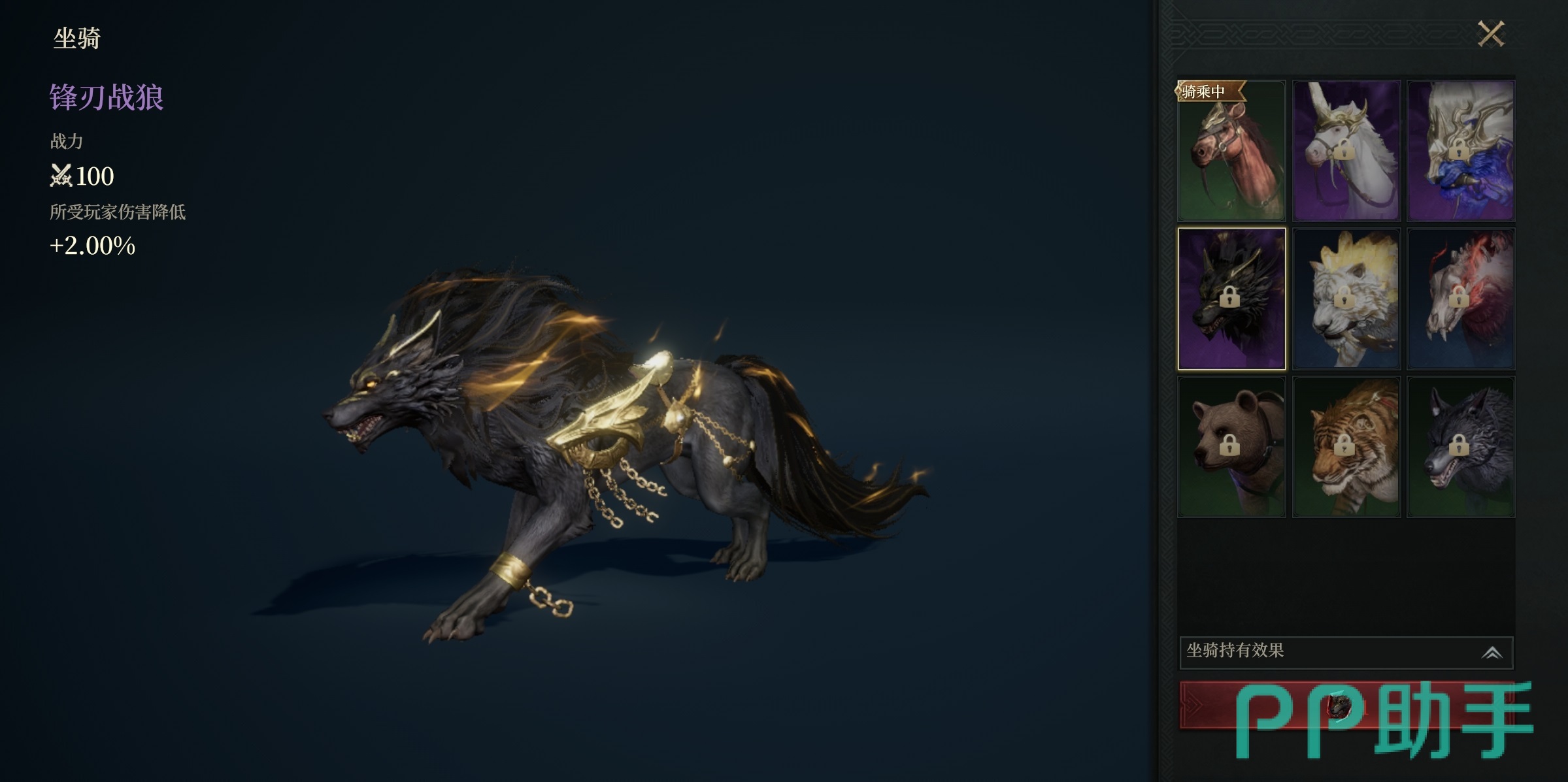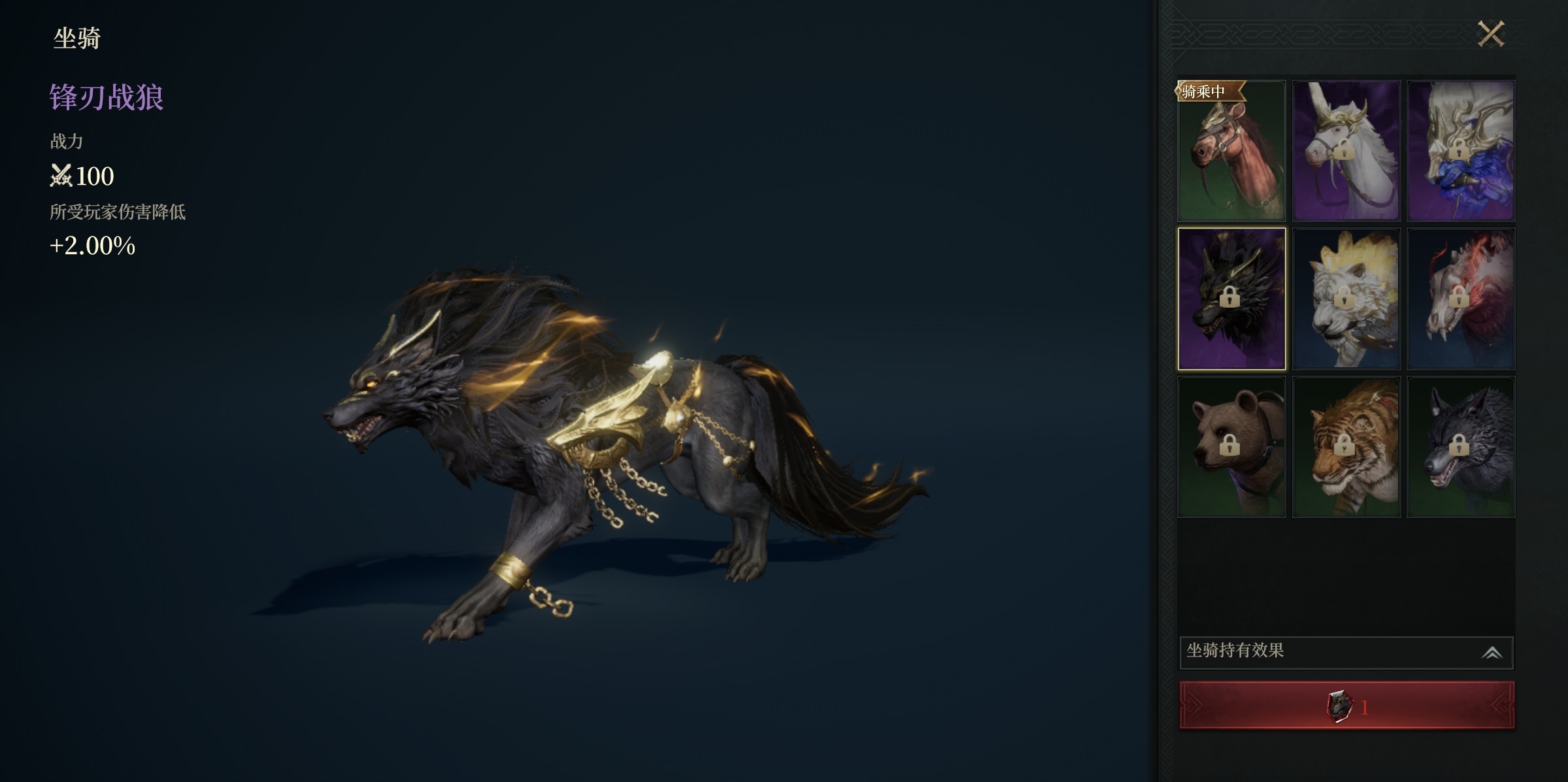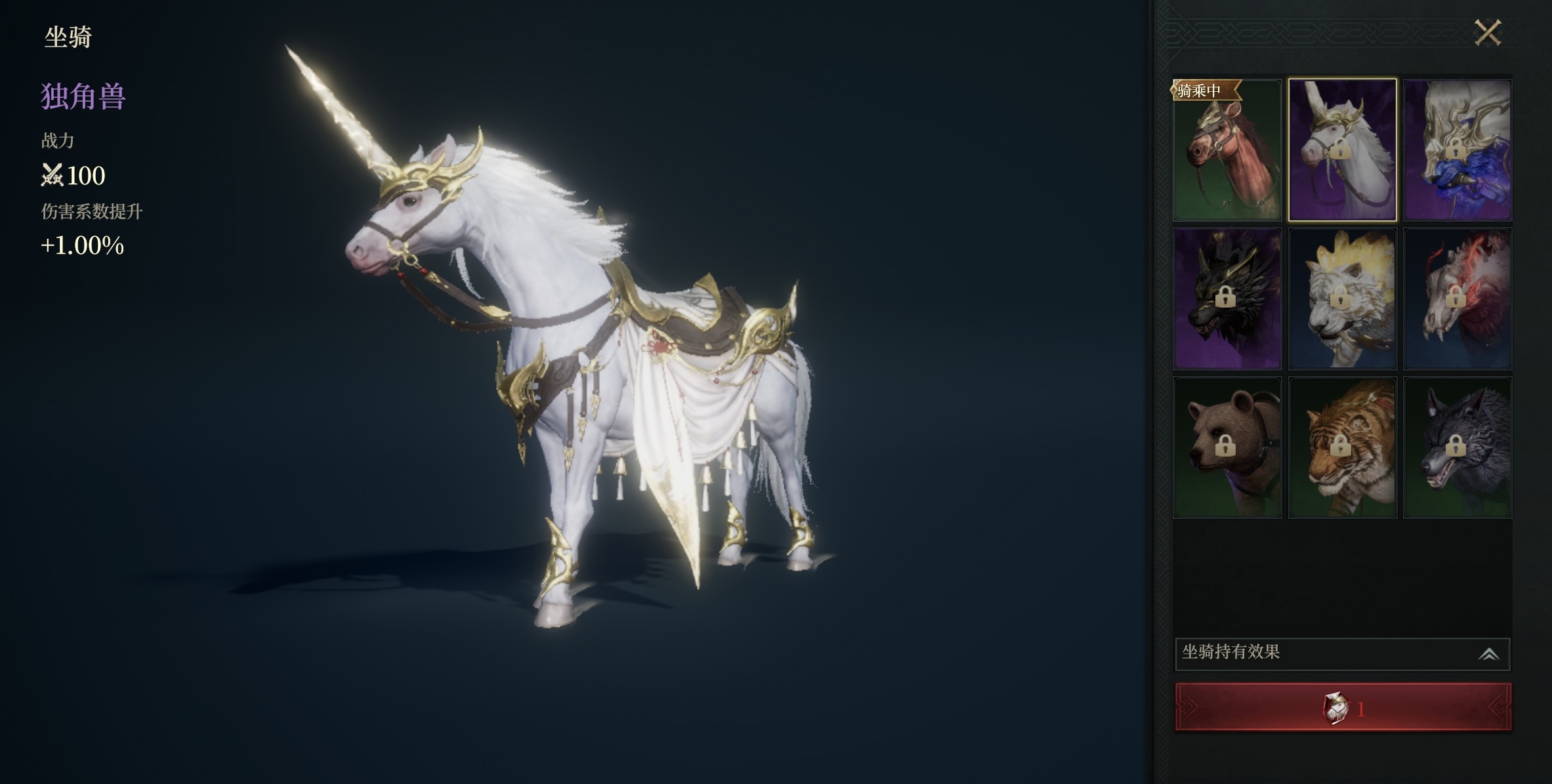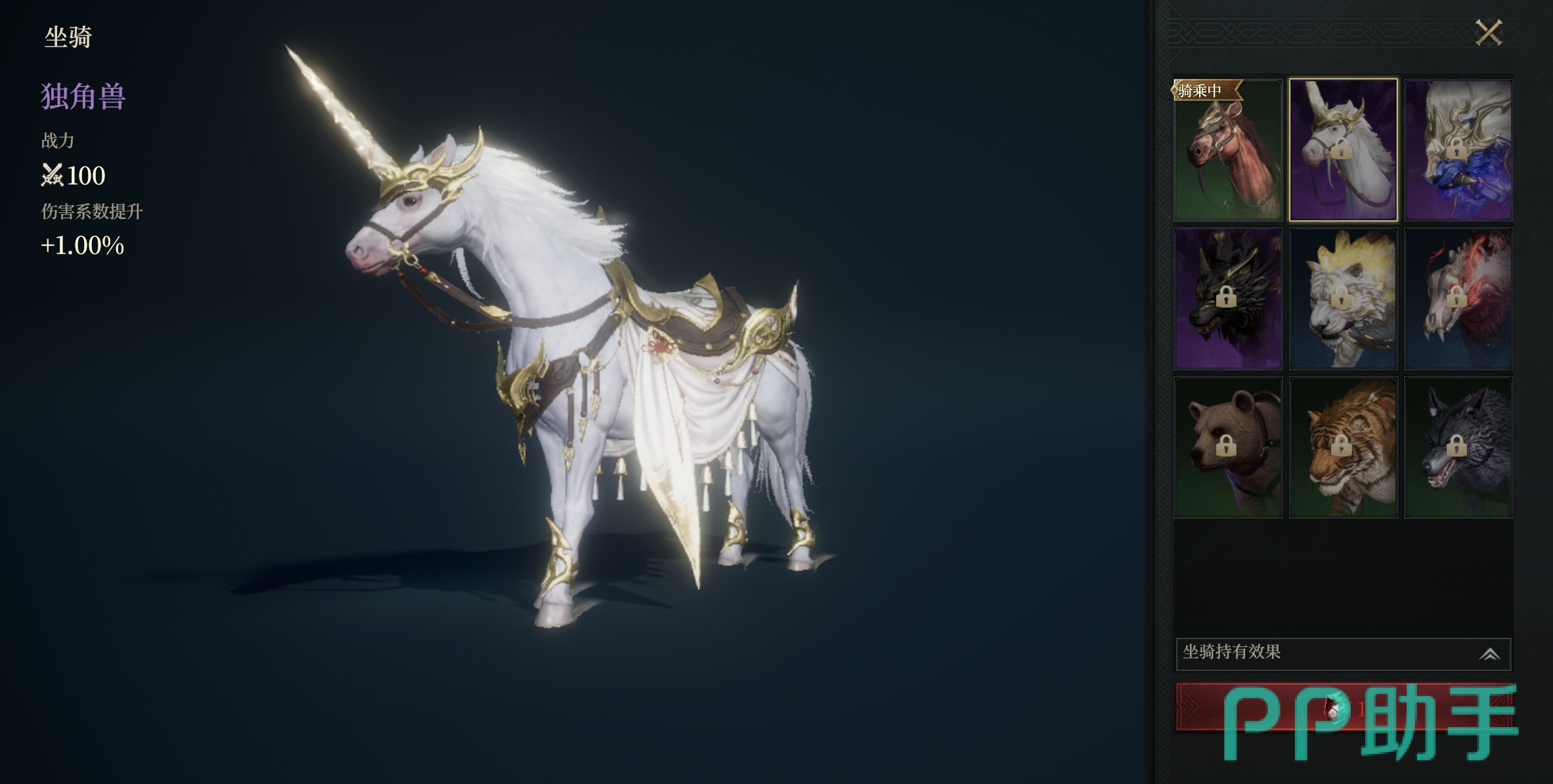 其余七种坐骑当前已公开属性,但具体获取方式尚未全面上线。根据测试版本信息整理如下:独角兽——提升1%伤害系数;星瀚狮虎——提高2%对玩家造成的伤害;锋刃战狼——使受到的玩家伤害降低2%;血影魔熊——增加1%对怪物伤害;撼山熊——最大法术防御+5点;镇狱虎——最小法术防御+5点;啸月狼——最大物理防御+5点。