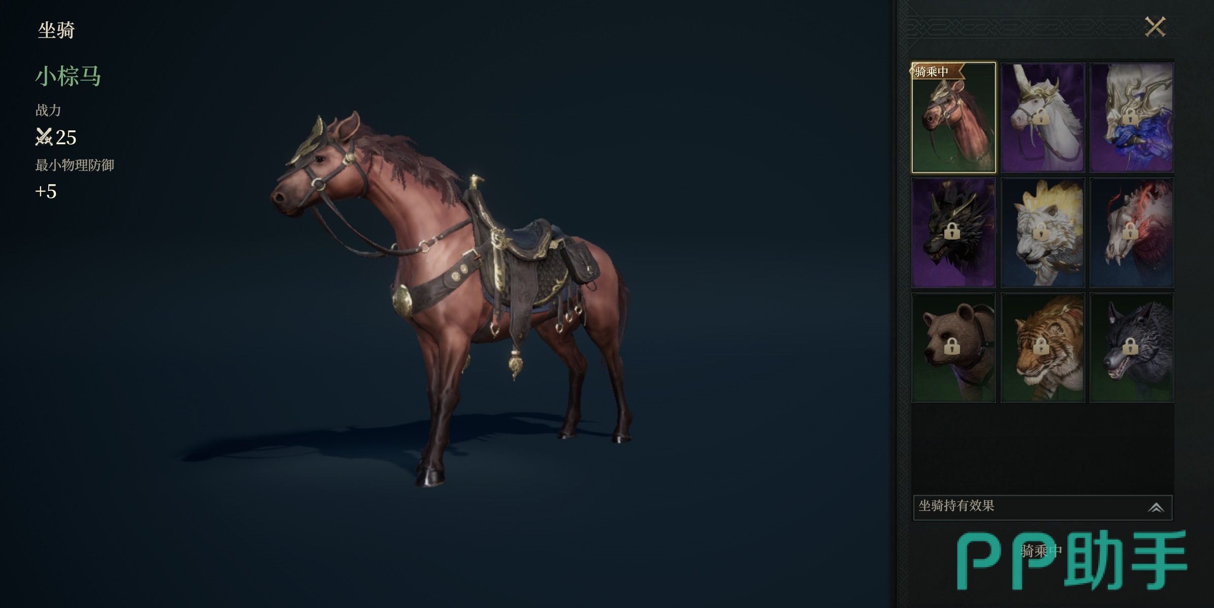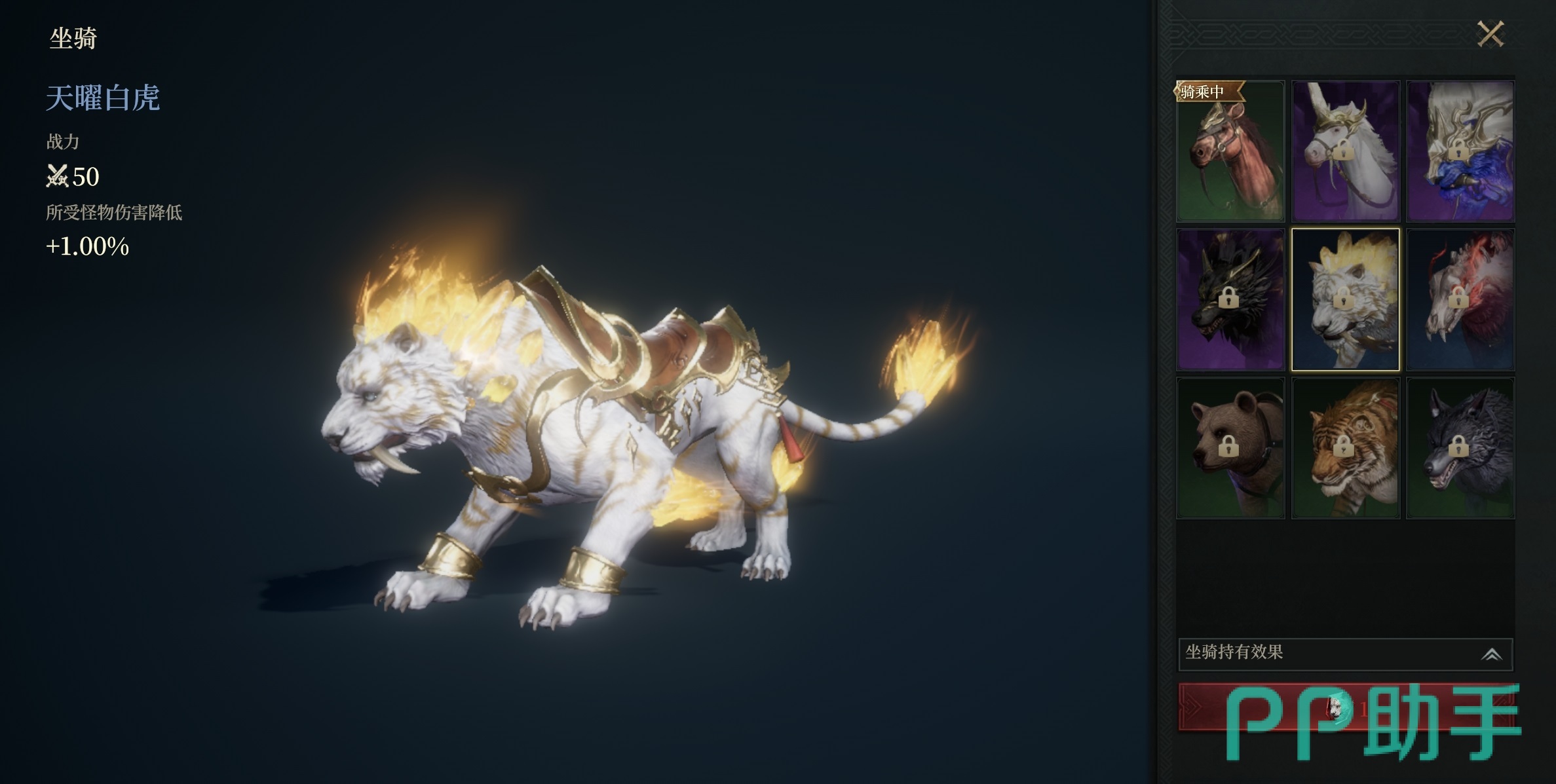 目前开放的第一档坐骑为小棕马,属于初始赠送类型,完成主线剧情早期任务即可自动激活。属性方面提供+5点最小物理防御,是所有玩家起步阶段的基础坐骑。第二档为天曜白虎,品质定位为蓝色精良,具备“所受怪物伤害降低1%”的被动效果,在PVE场景中具备明确减伤收益。该坐骑暂定通过连续签到活动解锁,属稳定可控的获取路径。
