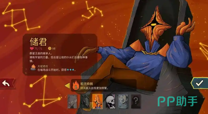 储君并非传统意义上的泛用型角色,其强度高度依赖精准的卡组构建与阶段化资源调度。整个体系围绕两张不可替代的核心卡展开:一是“群星之子”,作为全角色唯一具备主动触发护甲的防御卡,在强化后可提供稳定承伤能力,配合复抓机制能快速建立高强度防护层,是中前期生存的关键支点;二是“汇流”,该卡无法通过常规战斗或事件获取,必须在商店购入,其保留全部手牌的效果直接决定费用链完整性——缺失将导致高费关键卡空转、核心联动失效,整套体系陷入停滞。