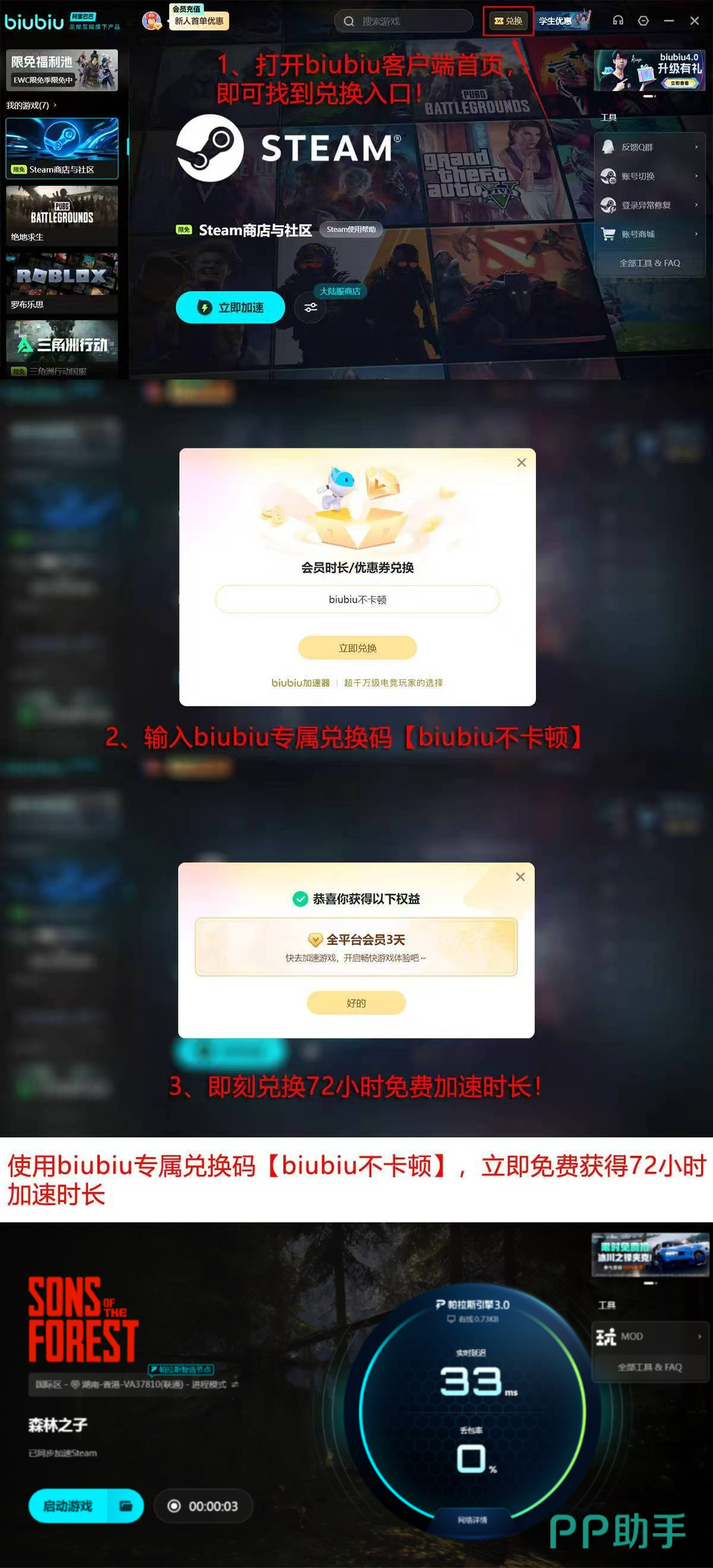 限时福利持续开放:新注册用户即赠24小时全节点网络加速权益,输入专属口令【biubiu不卡顿】额外领取72小时高级加速服务,累计享96小时免费加速时长,充分保障多人协作、洞穴攻坚与大型建筑搭建等关键环节的流畅性与稳定性。