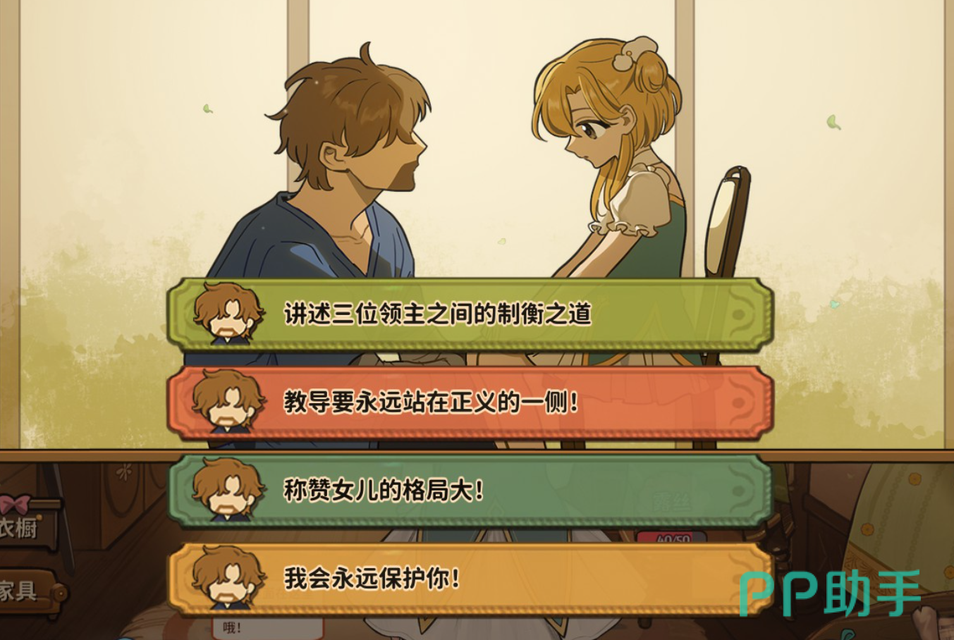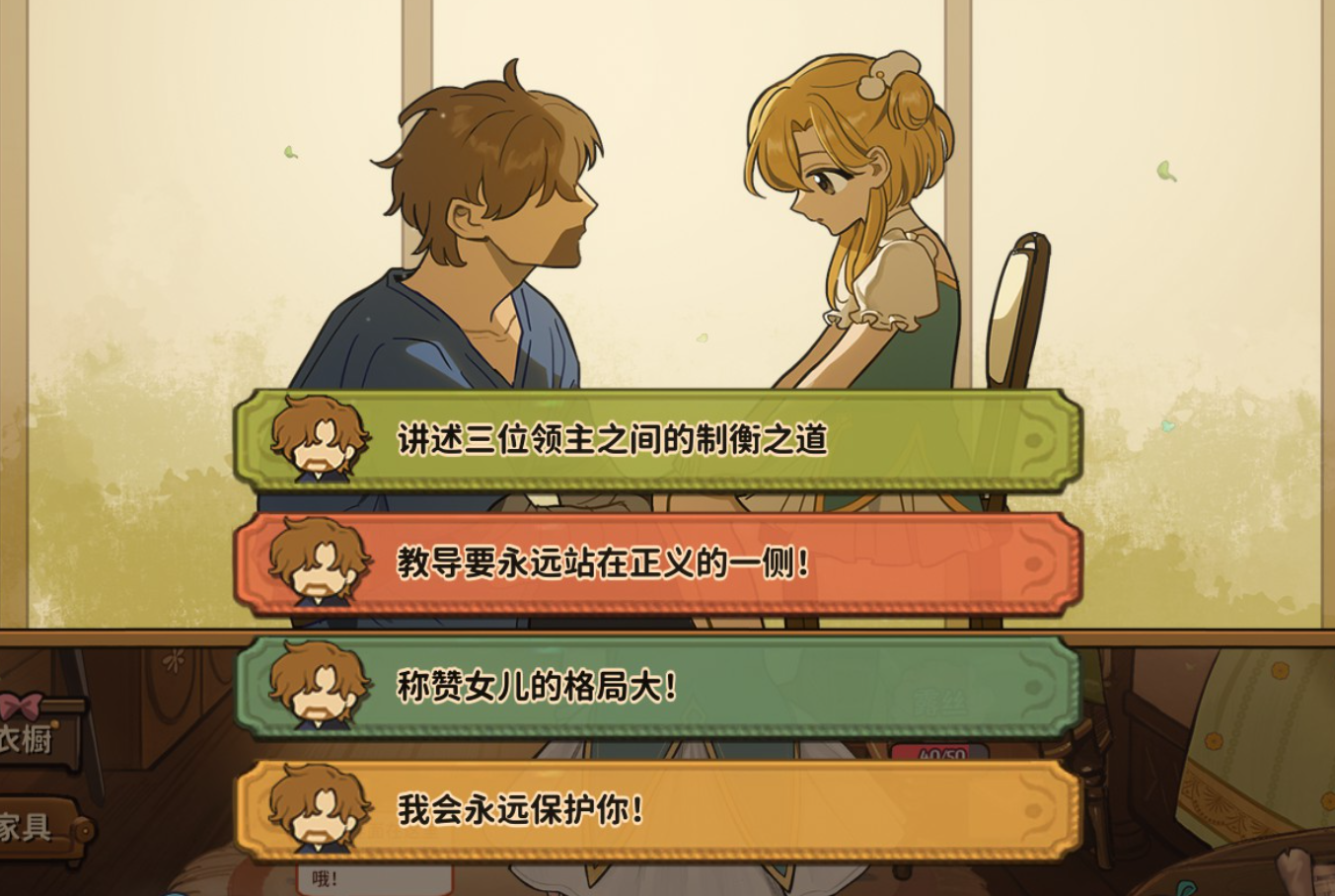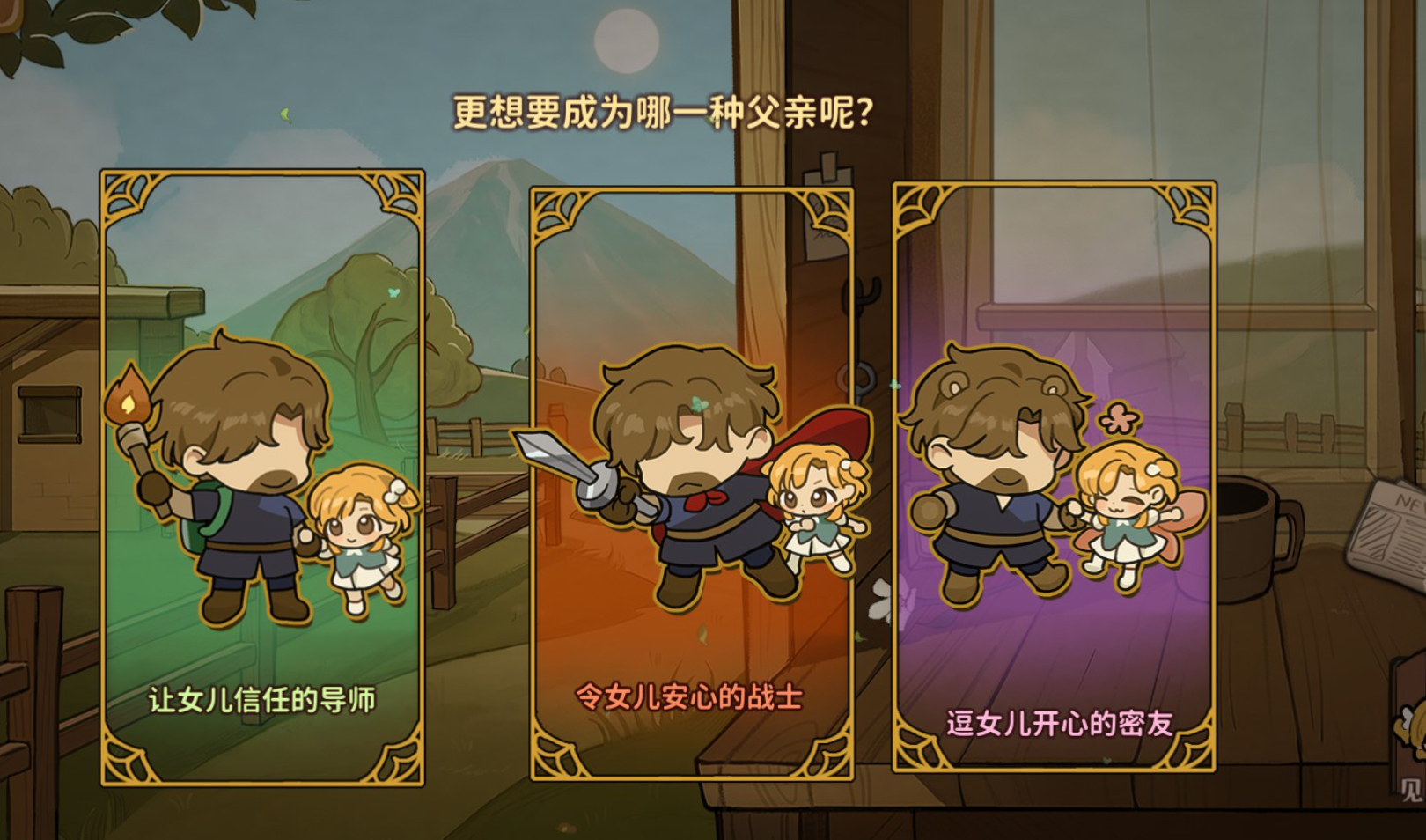 占卜师相关事件中,若选择“教她保护自己”,将获得额外博学值,进一步推动智慧成长路径。而在女儿年满12岁后的重要节点,选择“永远保护”可提高爱值,爱值积累至一定程度将解锁更多温馨的家庭互动剧情;而选择“勇往直前”则会强化勇敢属性,使其在面对危机情境时更倾向于采取主动应对策略。