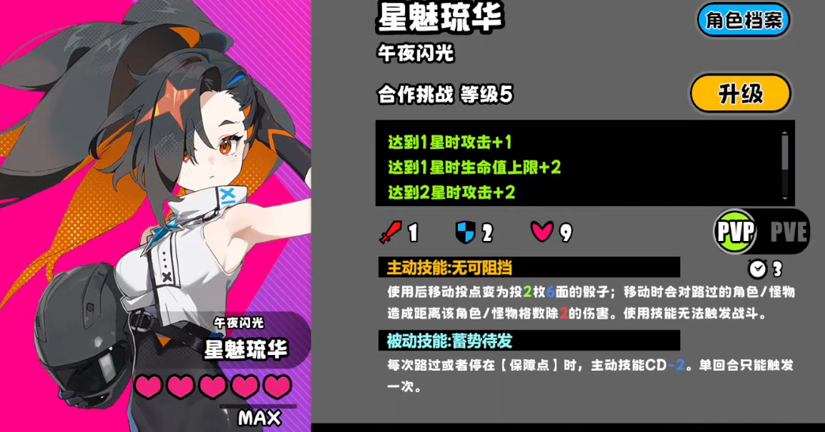 她的核心主动技能名为“无可阻挡”,在PVE环境下激活后,移动路径将转化为两枚六面骰子投掷结果,且移动过程中对途径的所有敌方单位造成等同于移动格数×2的固定伤害;该效果不触发任何战斗判定,属于纯位移附带伤害机制。进入PVP场景后,技能逻辑调整为:移动途中对经过的敌方目标造成(2+自身攻击力)点伤害,同样不引发战斗交互。