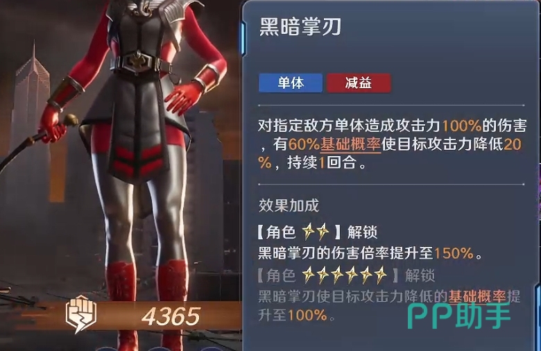 她的两个主动技能分别承担增益与压制职能。技能“黑暗操控”可使自身及左右相邻单位获得20%攻击力提升;若受增益对象为古阿帝国角色,还将额外获得10%能量恢复效率加成。该效果兼顾团队输出强化与循环节奏优化,尤其利于依赖技能连发的古阿系主力。另一技能“黑暗掌刃”则针对敌方单体施加伤害,并以60%基础概率降低目标攻击力,有效抑制敌方核心输出单位的爆发能力;当亡灵吉娜升至6星后,该减益触发概率提升至100%,实现稳定压制,大幅提升战局控制力。