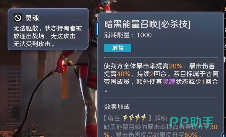 必杀技“暗黑能量召唤”是其战略级辅助能力的集中体现:释放后,全体友方单位获得20%暴击率与40%暴击伤害提升,覆盖全队双暴维度,适配多种输出体系。更关键的是,若场上已有处于灵魂状态的古阿帝国角色,该必杀技可使其灵魂冷却缩短一回合,加速关键单位返场节奏。正因如此,亡灵吉娜不仅适用于常规辅助位,在古阿帝国专属阵容中更能发挥体系联动优势,例如与亡灵裘达、亡灵摩尔德组成三古阿组合,最大化利用其势力加成与复活协同机制。
