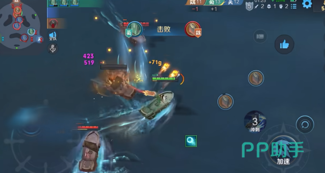 地图中不仅包含广阔的水域,还分布着若干小型陆地区域,这些区域藏有可用于升级战舰的关键资源。收集资源可提升船只等级,增强防御力与攻击力。若战船被敌方击毁,两名成员将坠入海中,直接退出本局战斗,因此保护己方船只、高效获取资源成为取胜的核心策略之一。