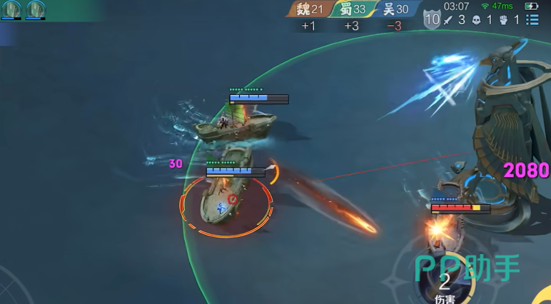 不同于传统的5v5竞技模式,星火赤壁引入了创新的PVPVP机制,每局比赛将由三支队伍同场竞技,每队6名玩家,共计18人同时参与。战斗场景设定在广阔的海域之上,玩家需以双人组队形式操控战船进行移动与作战。一人负责驾驶船只航行,另一人则专注于观察战场局势并协助决策,高度依赖团队协作才能取得优势。