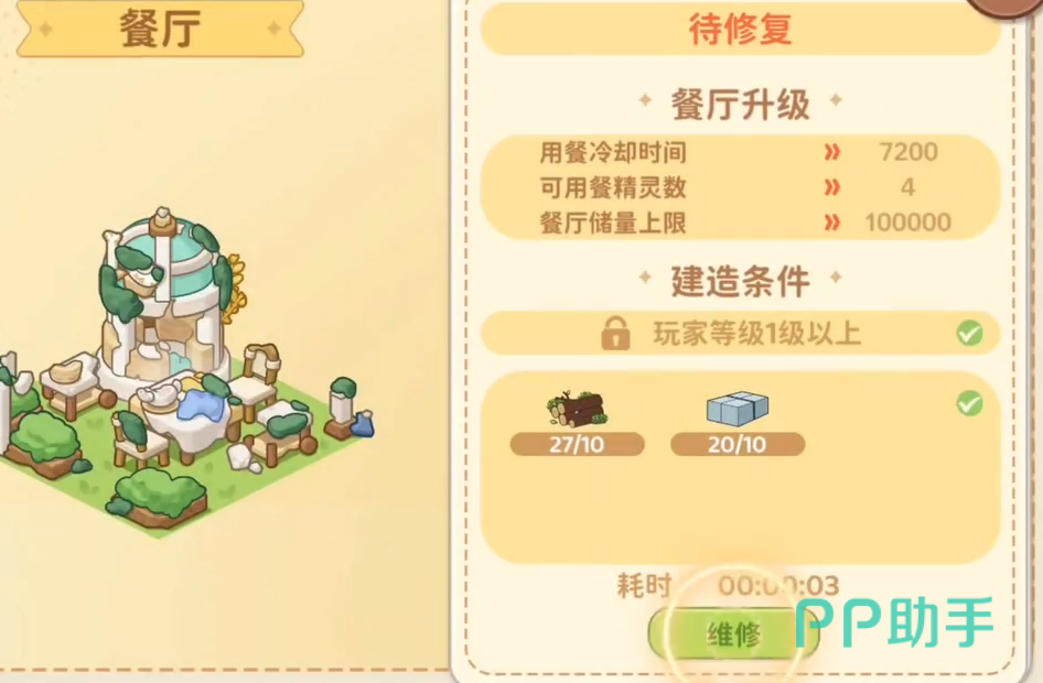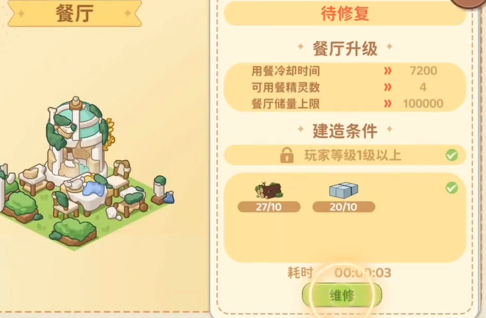 工坊作为全岛资源生产与建筑研发的核心枢纽,被列为优先修复目标。修复过程需调用岛上精灵协助,共可召唤4位能力均衡的精灵,任选其一即可启动维修任务。本次维修消耗固定资源:木头×10 或 石头×10。材料齐备后,工坊将迅速恢复运转。修复完成后,玩家可通过工坊解锁图纸系统,为后续各类建筑的建造奠定基础。
