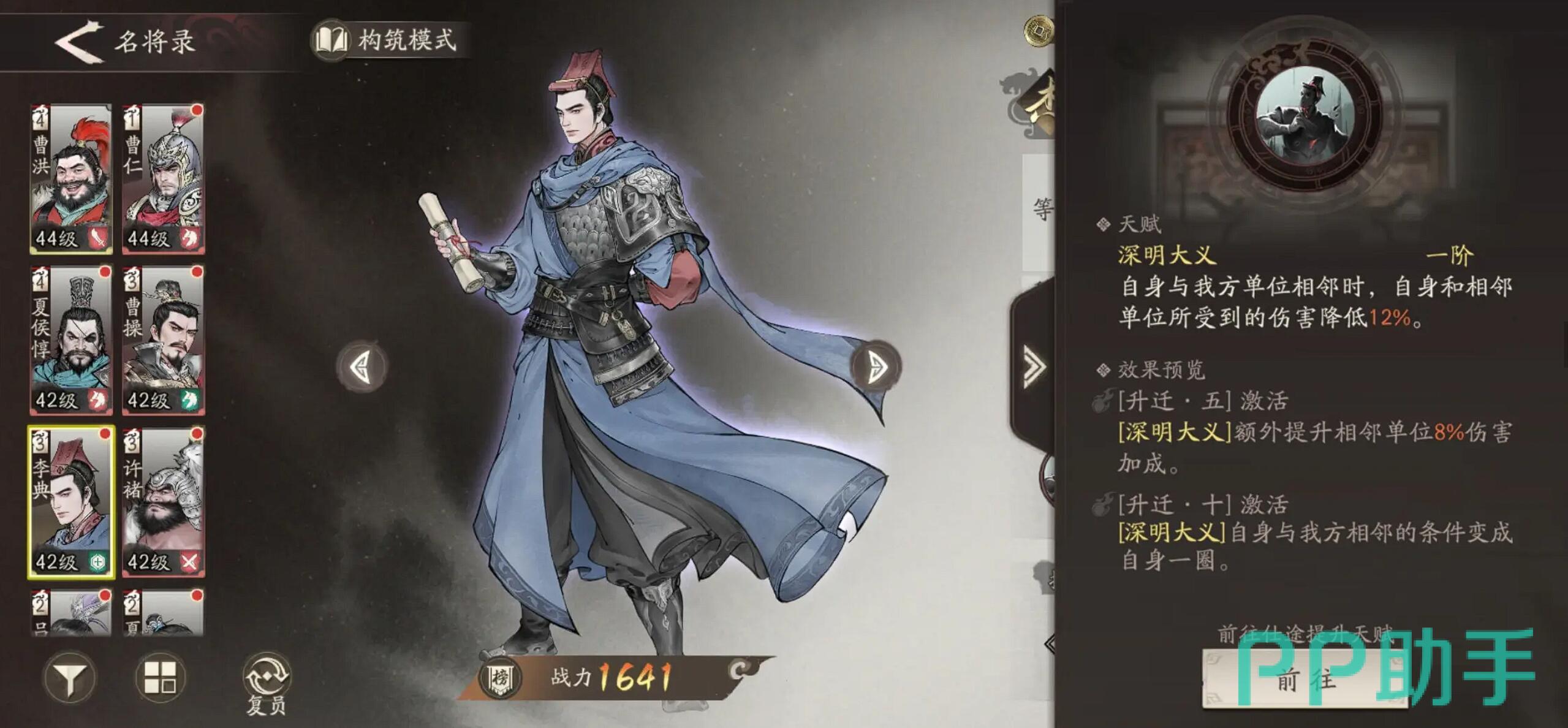 对比同类辅助角色,在开荒阶段使用李典比夏侯惇更为稳定,堪称平民玩家的优选。其自带战法“深明大义”触发频率极高,几乎每回合都能发挥作用。基础状态下,当与友军相邻时,双方可获得12%减伤;晋升至五阶后额外提供8%伤害加成;达到十阶时,影响范围扩展为周围一圈单位。实战中通常将其置于曹操与张辽之间,使两位核心同时享受减伤效果。这种持续性保护在持久战中表现尤为突出,其战略价值甚至超过部分治疗型武将。但需注意保持其与输出单位的距离适中,避免因站位过远导致技能失效。