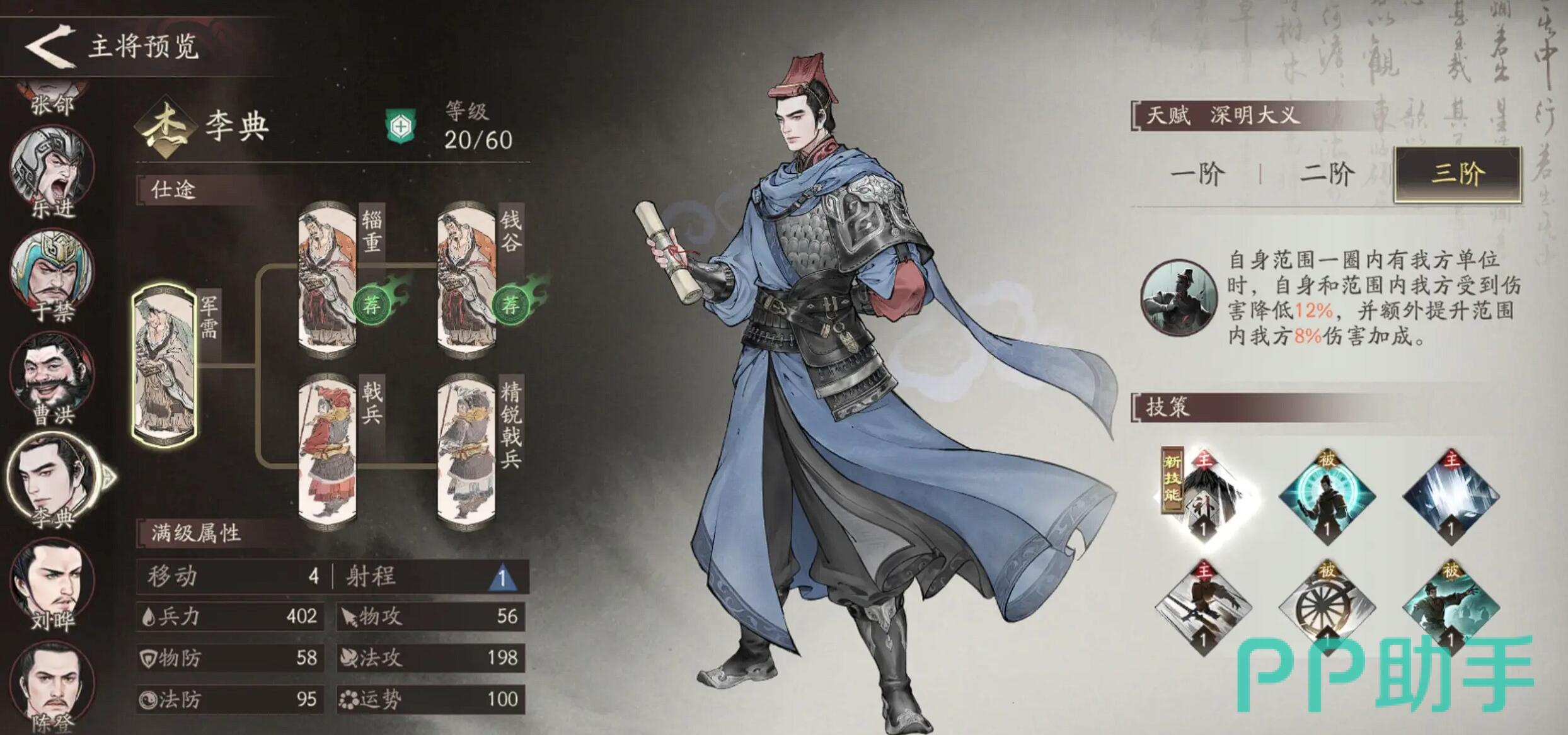 综上所述,李典是一位初期不起眼但越用越强的实用型武将。他无需争夺高级装备,也不占用主力资源,仅凭站位布局就能维持全队健康血线。在高阶战斗中,甚至可替代传统治疗位,为输出角色腾出更多战法格子以追求极限输出。建议尽早将战法经验投入到李典身上,达到7级后实战表现显著提升,是一款值得深入培养的功能型辅助。