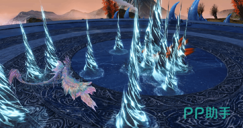 在战斗技能方面,嘲风采用施法类操作模式,拥有两种主要攻击方式。“翅翻羽接”为近程爆发技,释放时先展开双翼,随后交替挥动翅膀投射羽毛,在指定位置引发爆炸,造成范围伤害;另一技能“顶锋饕雨”则需短暂蓄力,激活后竖起头部羽毛,召唤风暴与洪流交织的能量体,在自身周围及目标区域形成冲击,适用于近距离压制对手。